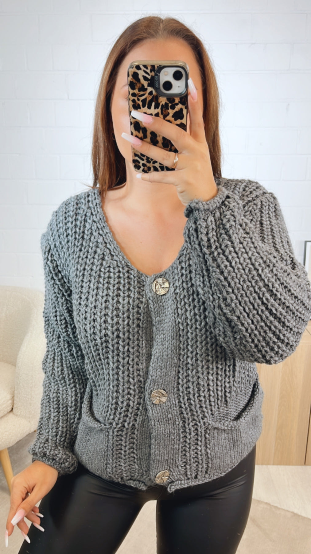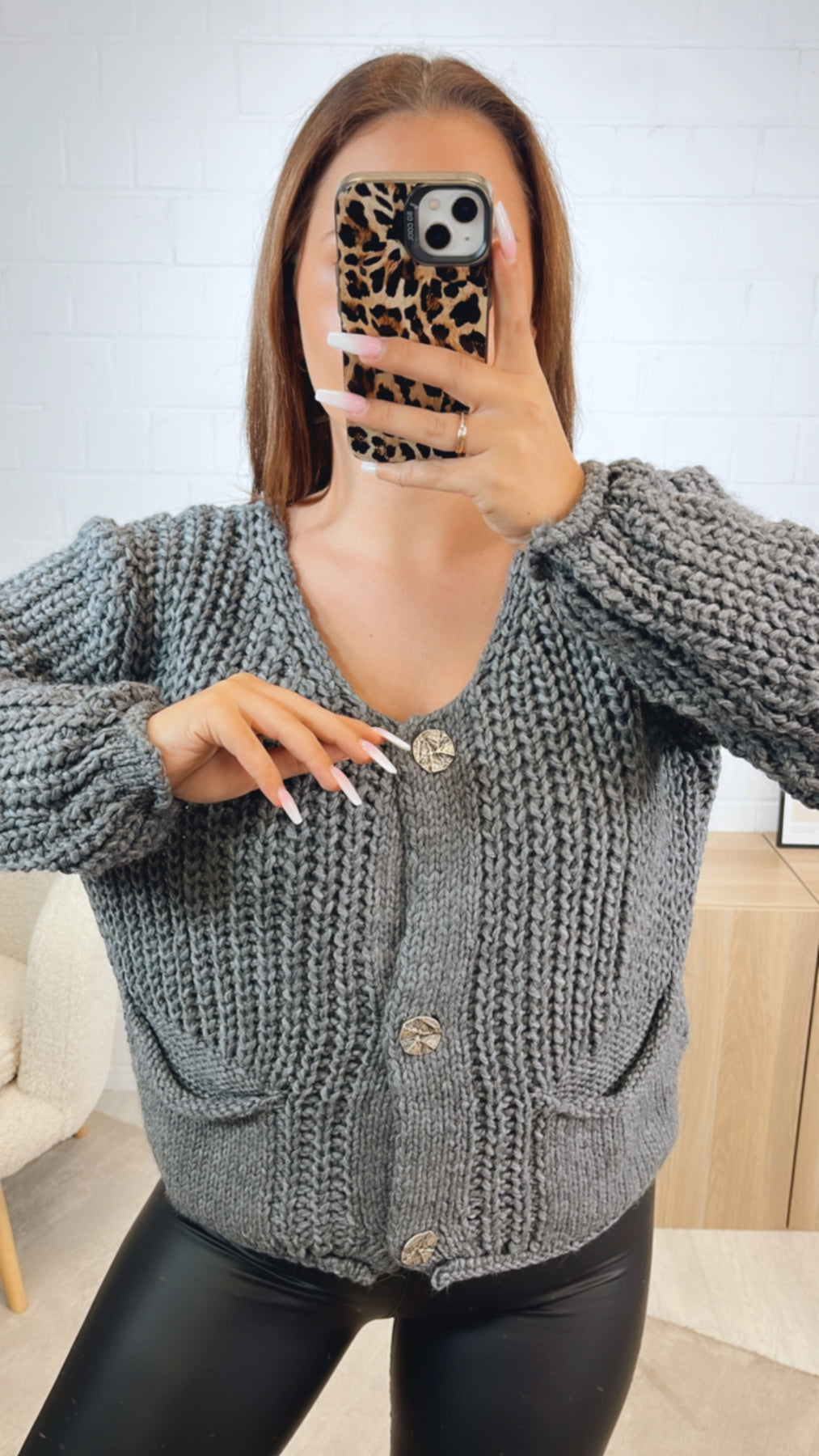grober, kurzer Strick Cardigan, große Knöpfe, Taschen / dunkel grau Art. 12446