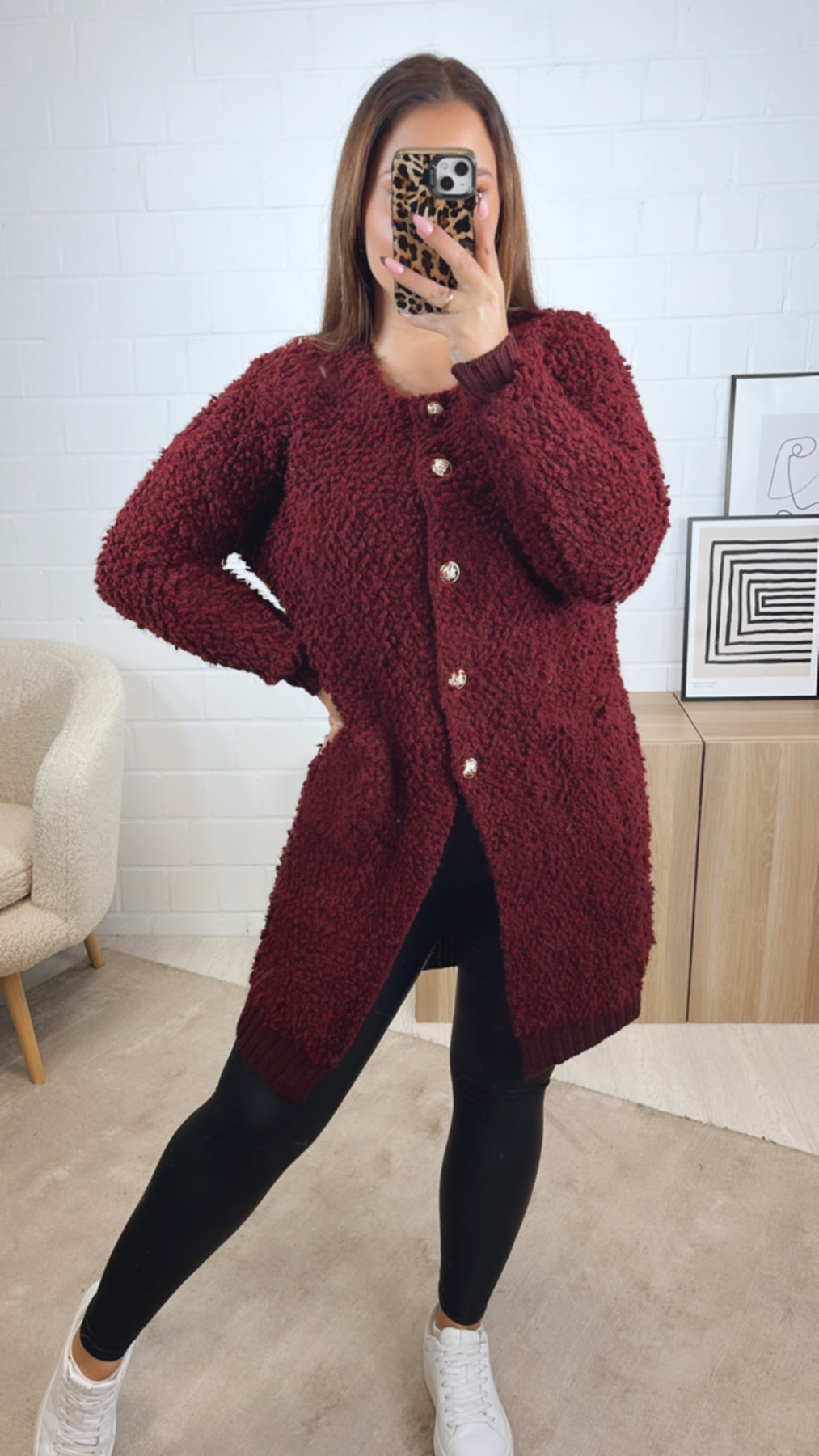 TEDDY langer Cardigan mit gold - silbernen Knöpfen, Taschen / bordeaux rot Art. 12834