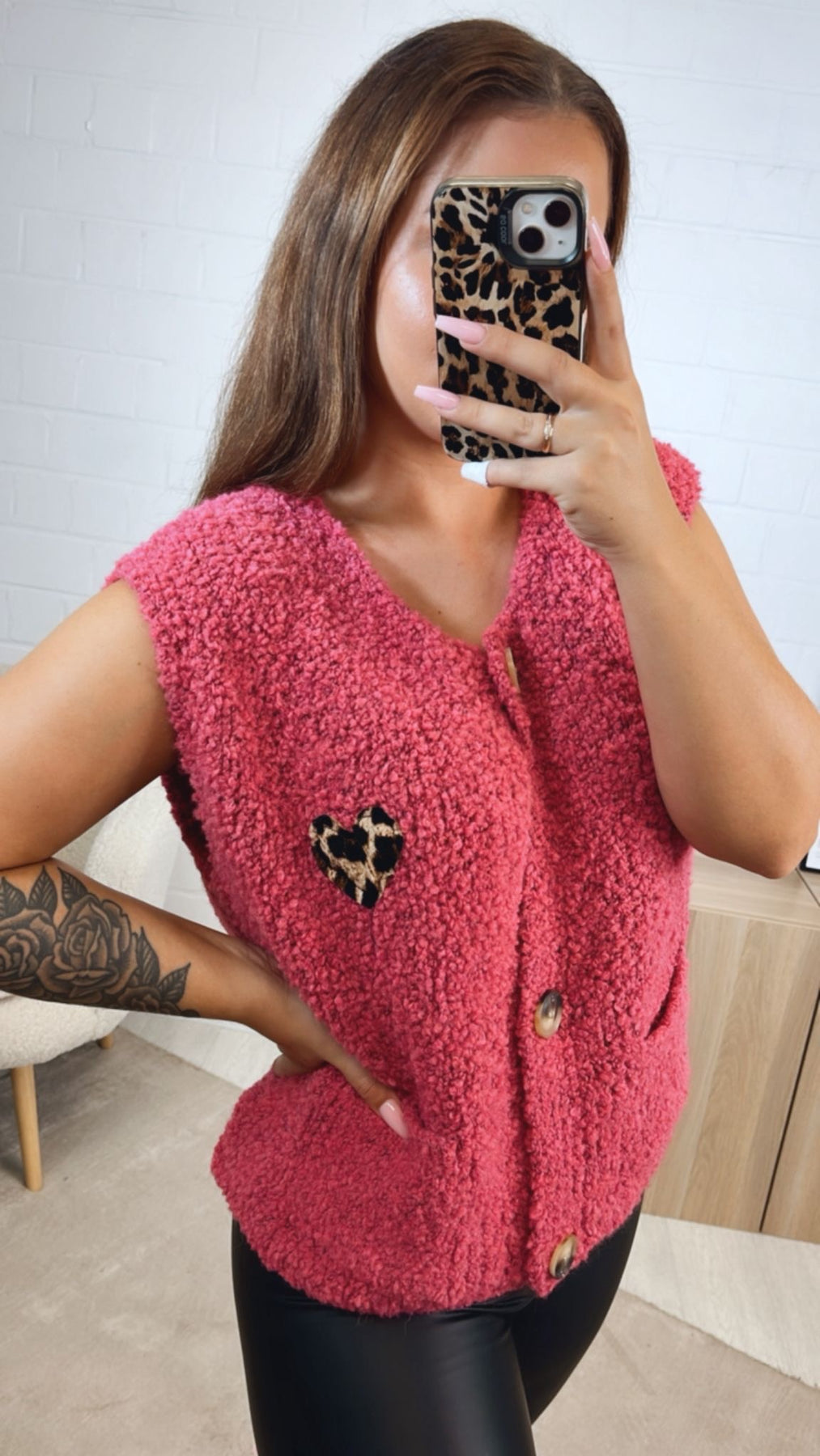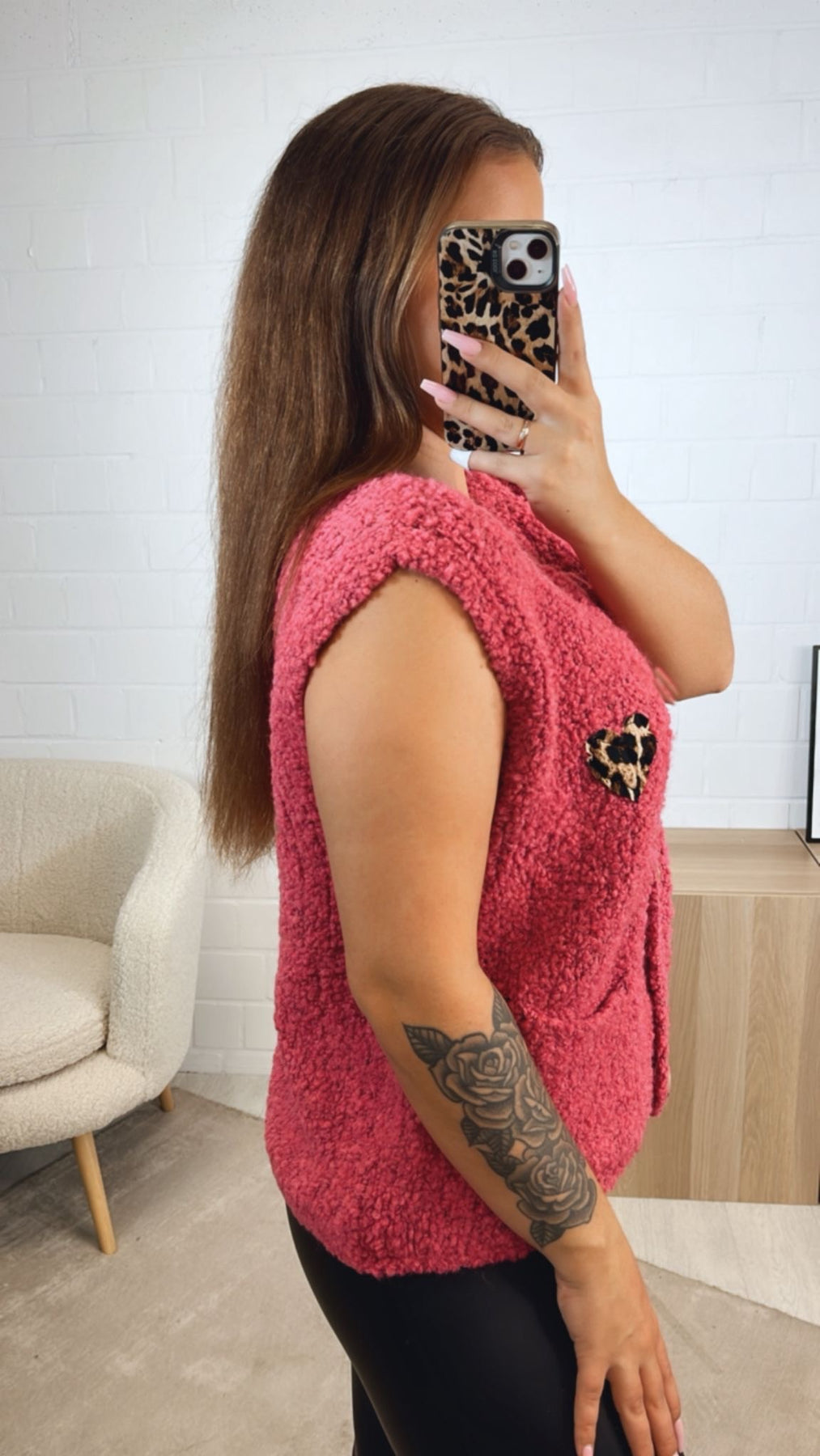 Schöne, weiche Strickweste, welche sich mit einer Knopfleiste variabel offen bzw. geschlossen tragen und kombinieren lässt und in dem angesagten Teddy-Look gearbeitet ist. Durch ihr LeoHerz auf der linken Vorderseite wird sie zudem zu einem absoluten Hingucker. Das Praktische: auf der Vorderseite hat sie außerdem zwei Eingriffstaschen angebracht.