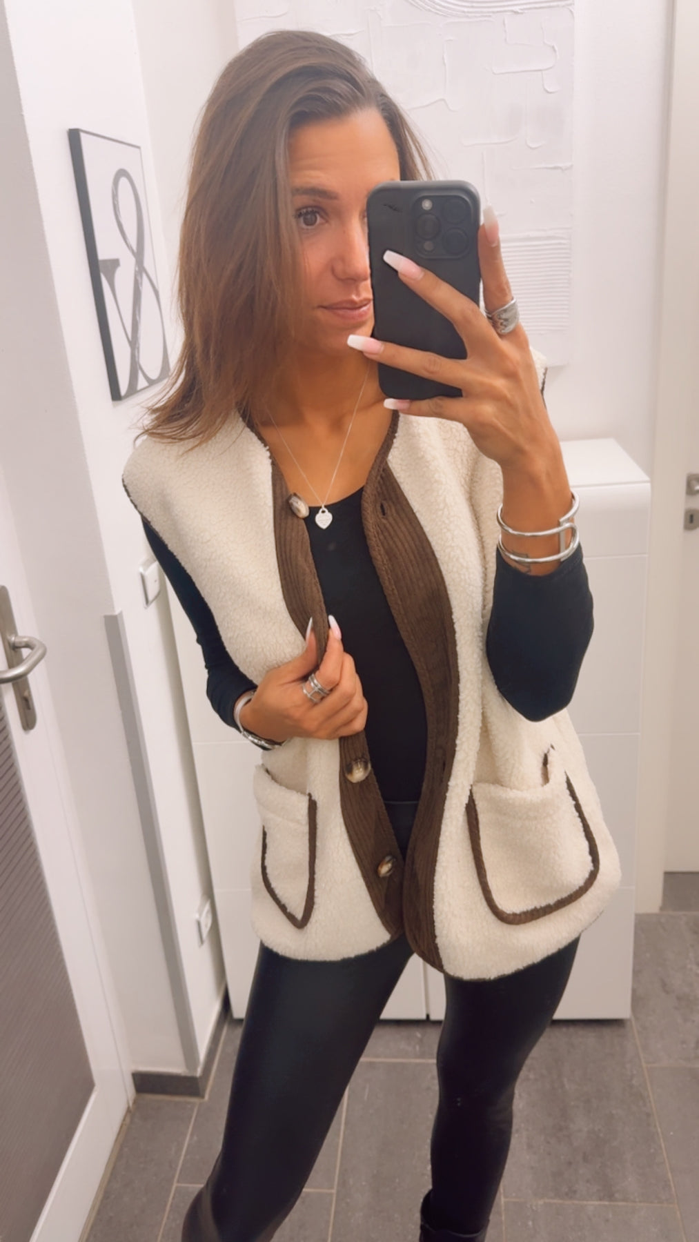 Super schöne, weiter geschnittene Weste, welche in einer tollen Teddyoptik gearbeitet ist. Ihre Knopfleiste ist in einem tollen Cordstoff unterlegt. Das Praktische: sie hat zwei Eingriffstaschen auf der Vorderseite.