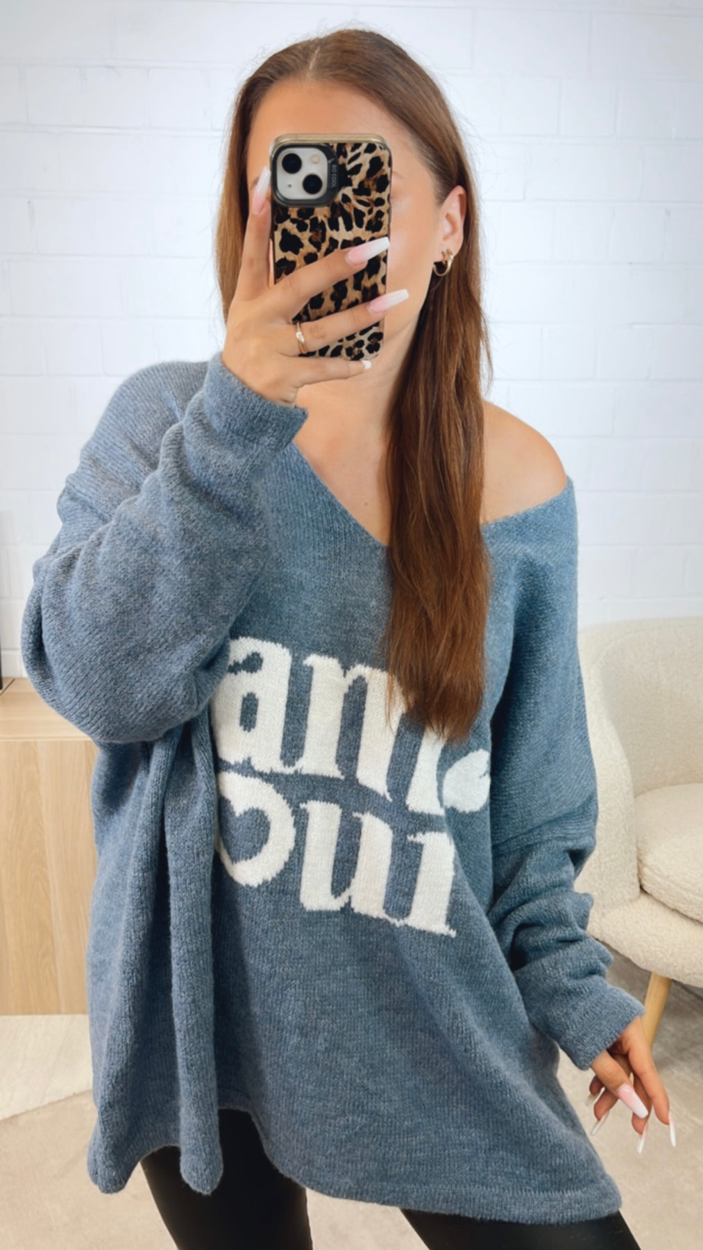 weiter Strick Pullover " Amour " / Denim blau - weiss Art. 12424