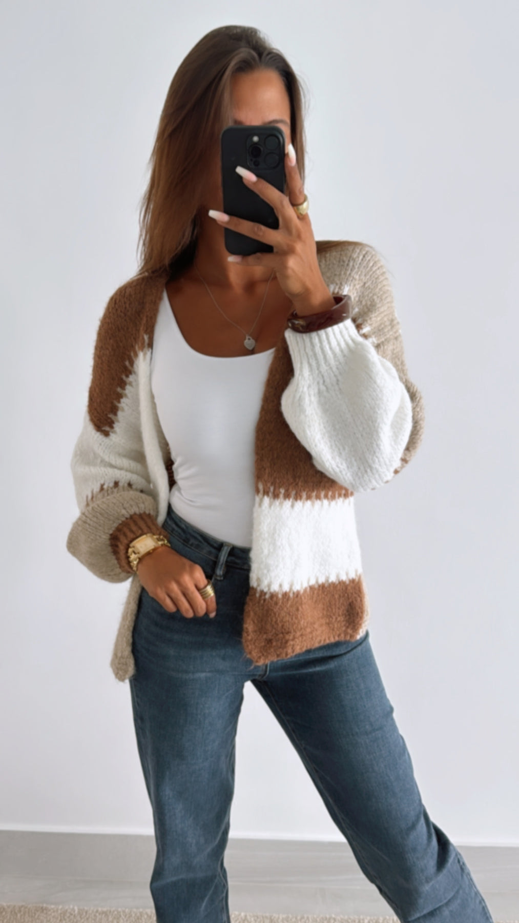 kurzer, mehrfarbiger Strick Cardigan / camel braun - weiss - beige Art. 11056