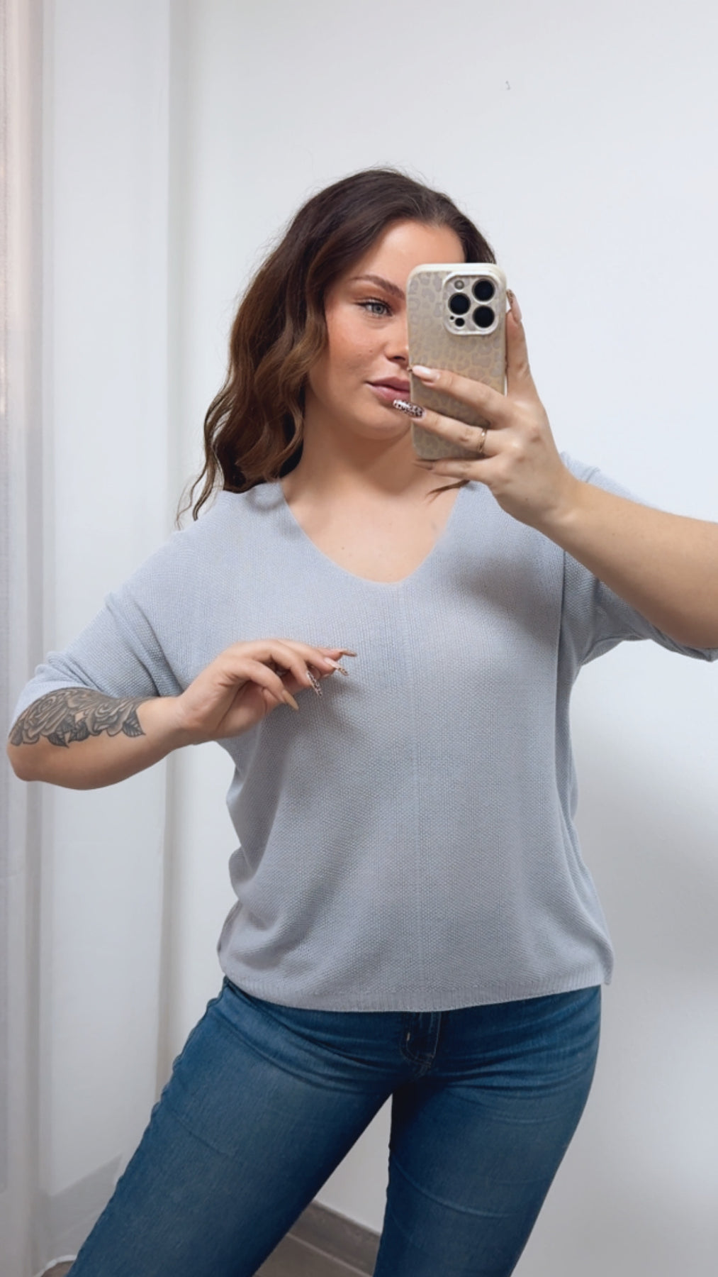 Sehr leichtes und fein gestricktes Oberteil. Es liegt super leicht und weich auf der Haut auf, hat einen V-Ausschnitt und kurze Arme.