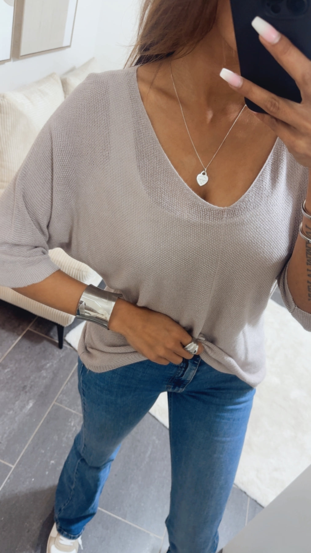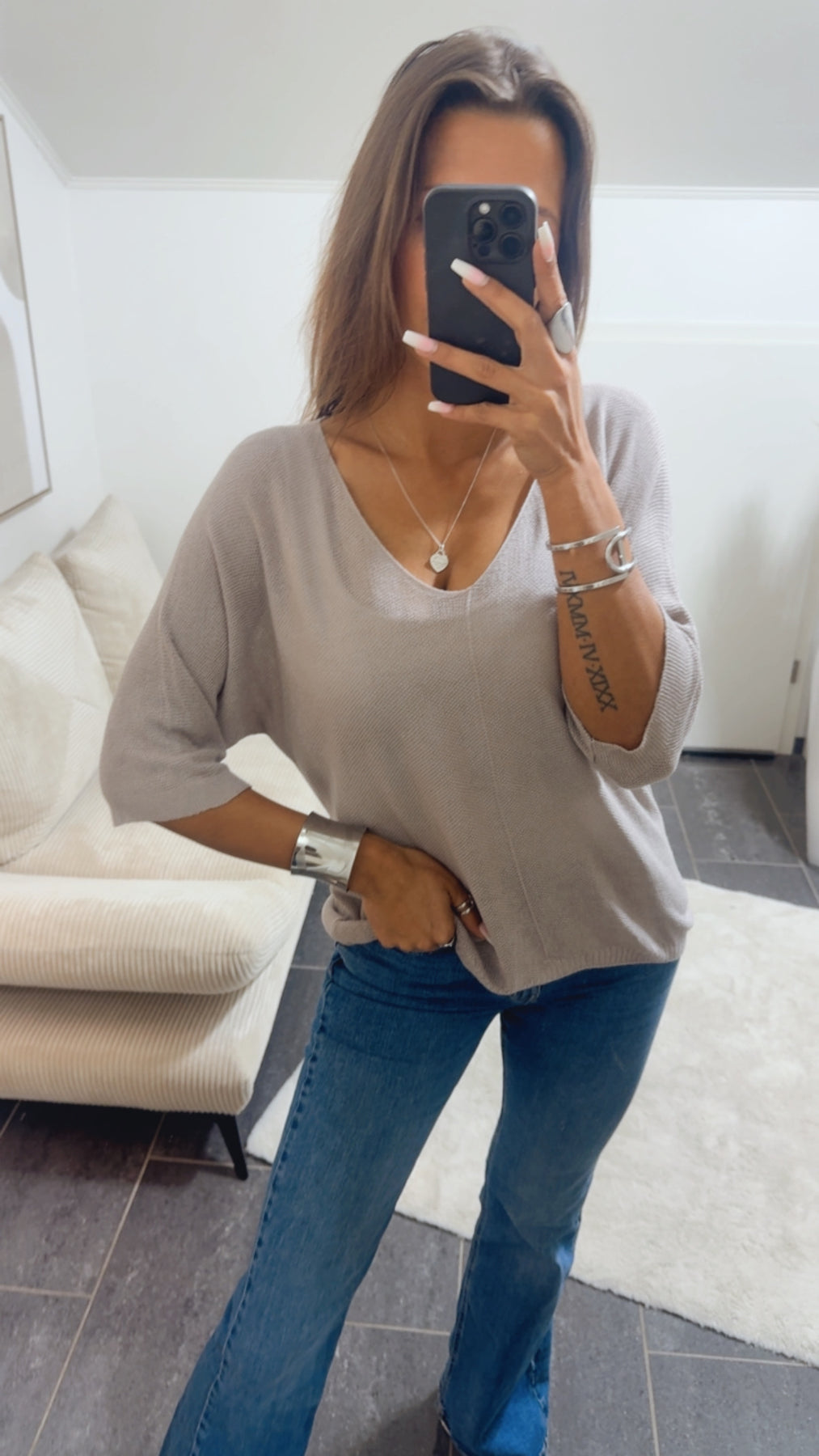 Sehr leichtes und fein gestricktes Oberteil. Es liegt super leicht und weich auf der Haut auf, hat einen V-Ausschnitt und kurze Arme.