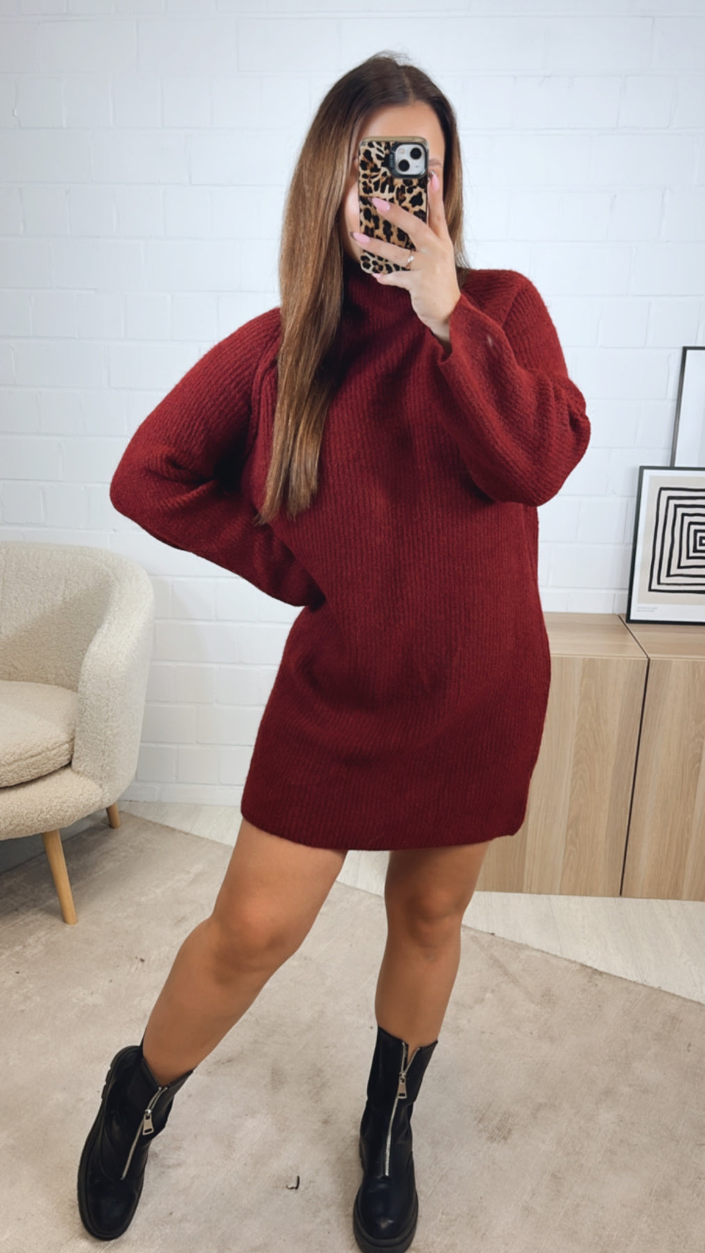 gradliniges Strick Kleid / Long Pullover mit weitem Arm, Stehkragen / bordeaux rot Art. 12795