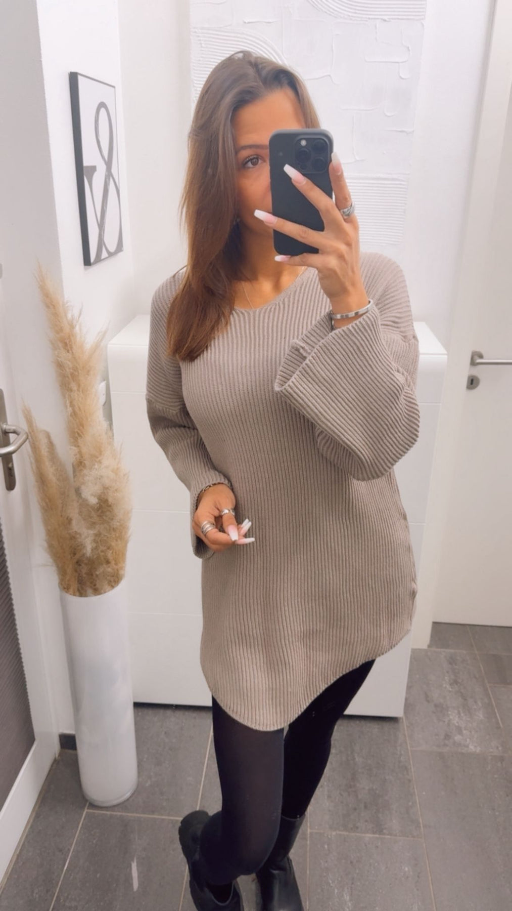Super schlichtes und tolle Strickkleid, welches gradlinig geschnitten ist. Seine Ärmel sind zudem lang und fallen ebenfalls gradlinig und weiter aus. Es lädt super zum einkuscheln ein und kann ebenfalls als Longpullover getragen und kombiniert werden.