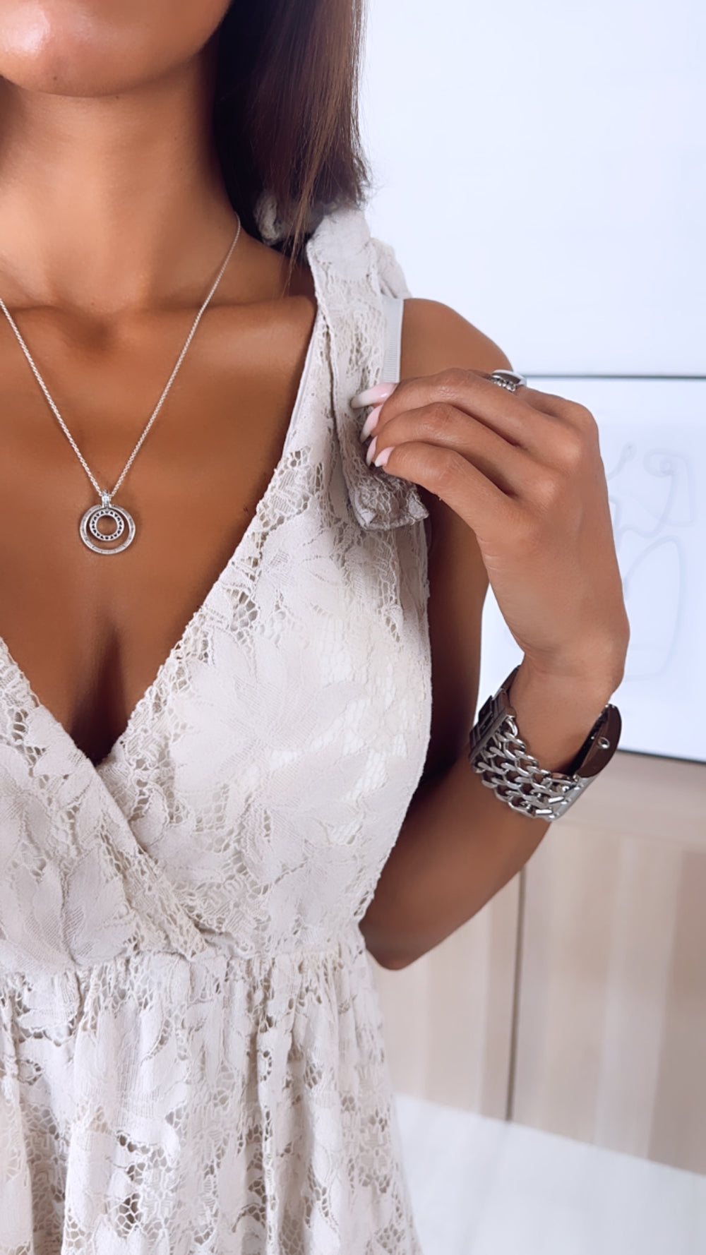 Super süßes und schickes, kurz geschnittenes Kleid. Es ist in einer Spitzenoptik gehalten und seine schmalen Gröger lassen sich mit einem Schleifchen individuell eng oder locker zuschnüren.