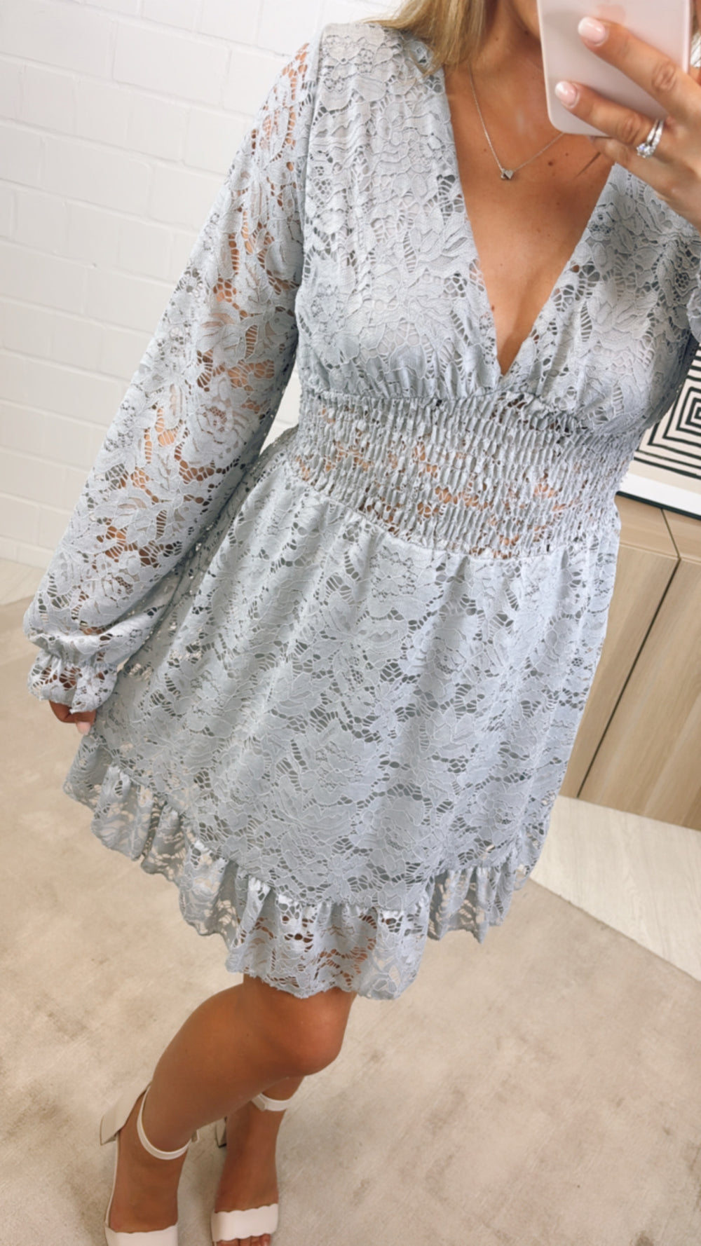 Super süßes und schickes, kurz geschnittenes Kleid. Es ist in einer Spitzenoptik gehalten. Im Taillenbereich ist es elastisch und das Praktische: es hat einen Unterrock eingearbeitet.