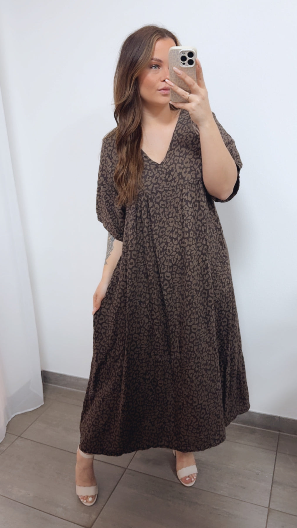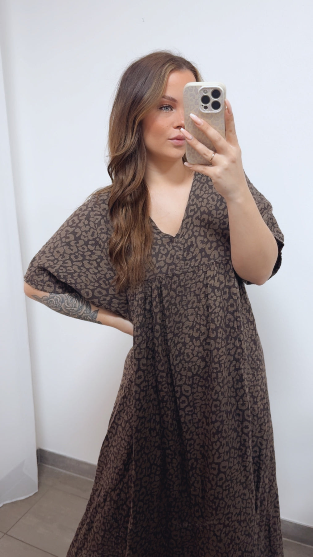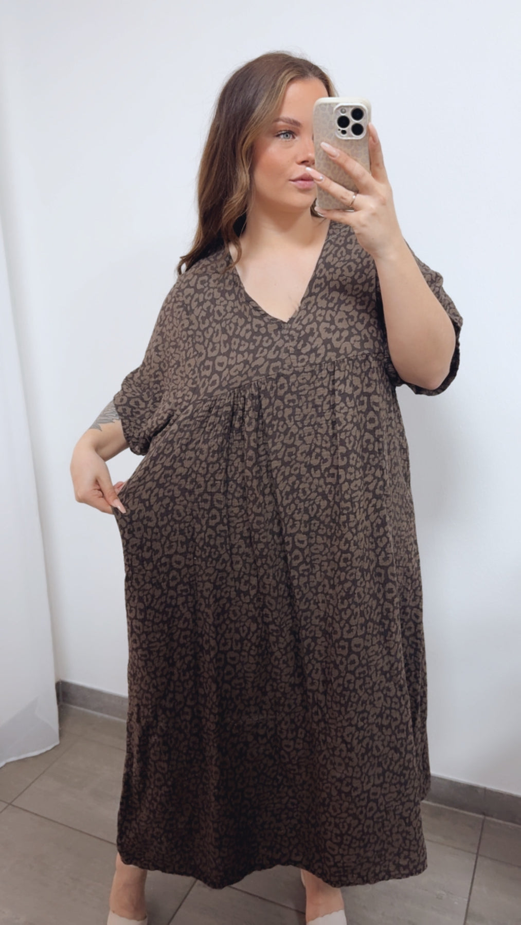 LEO langes Musselin Kleid, kurze Ärmel / dunkel braun - taupe Art. 14688