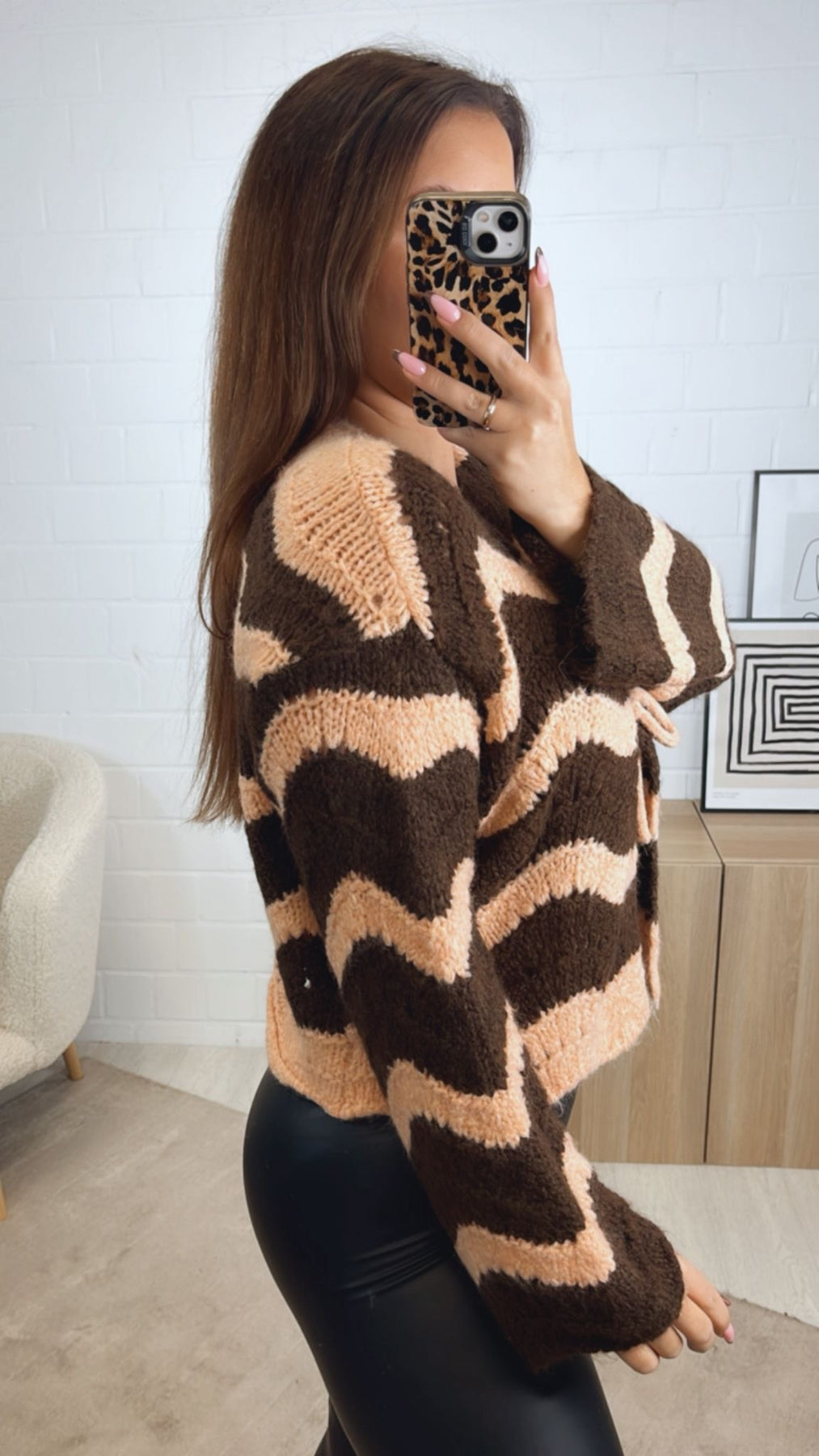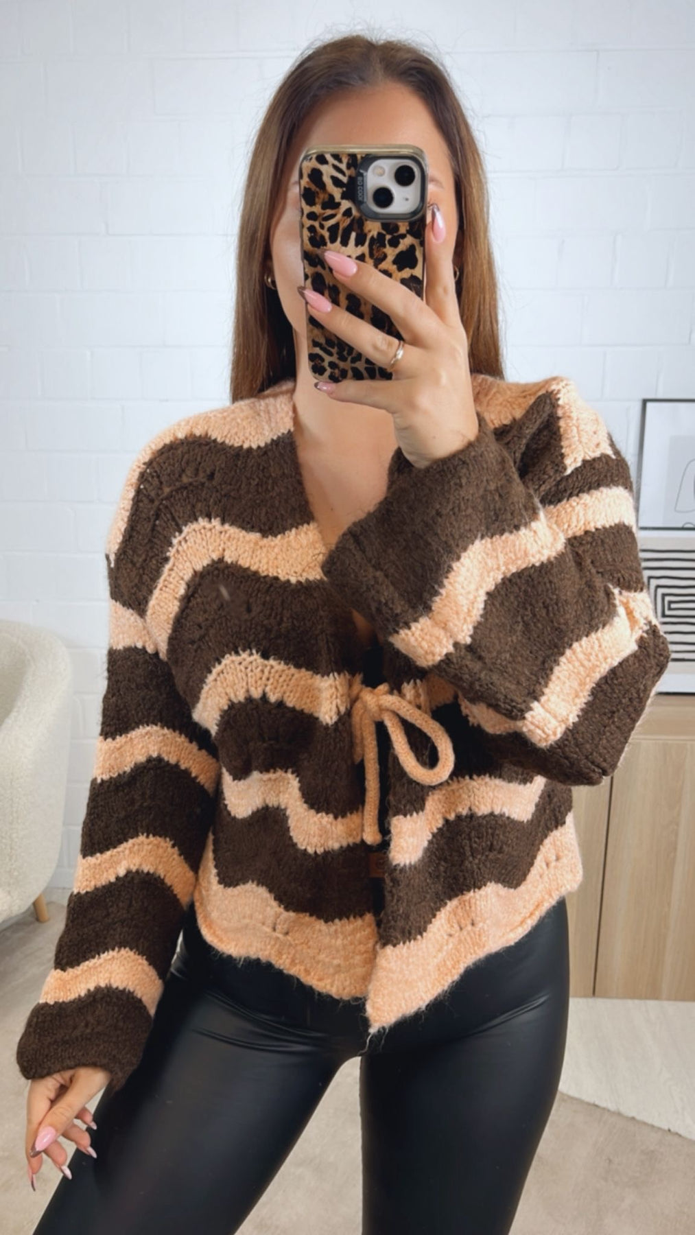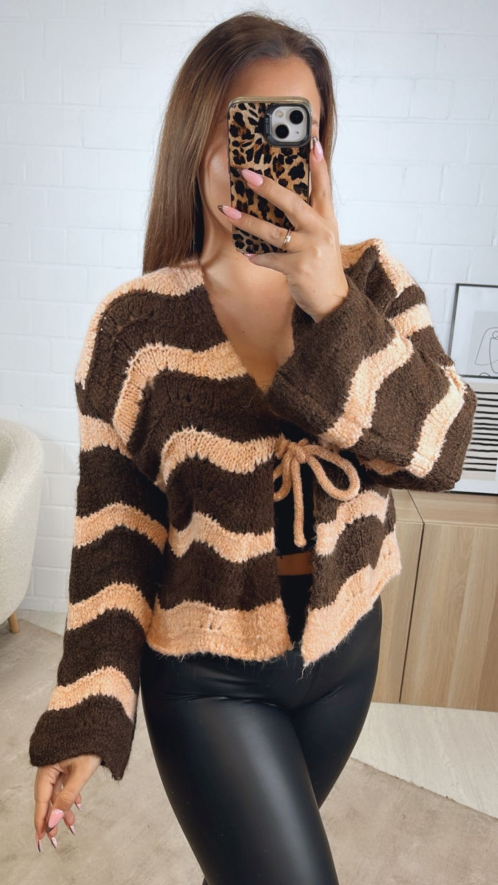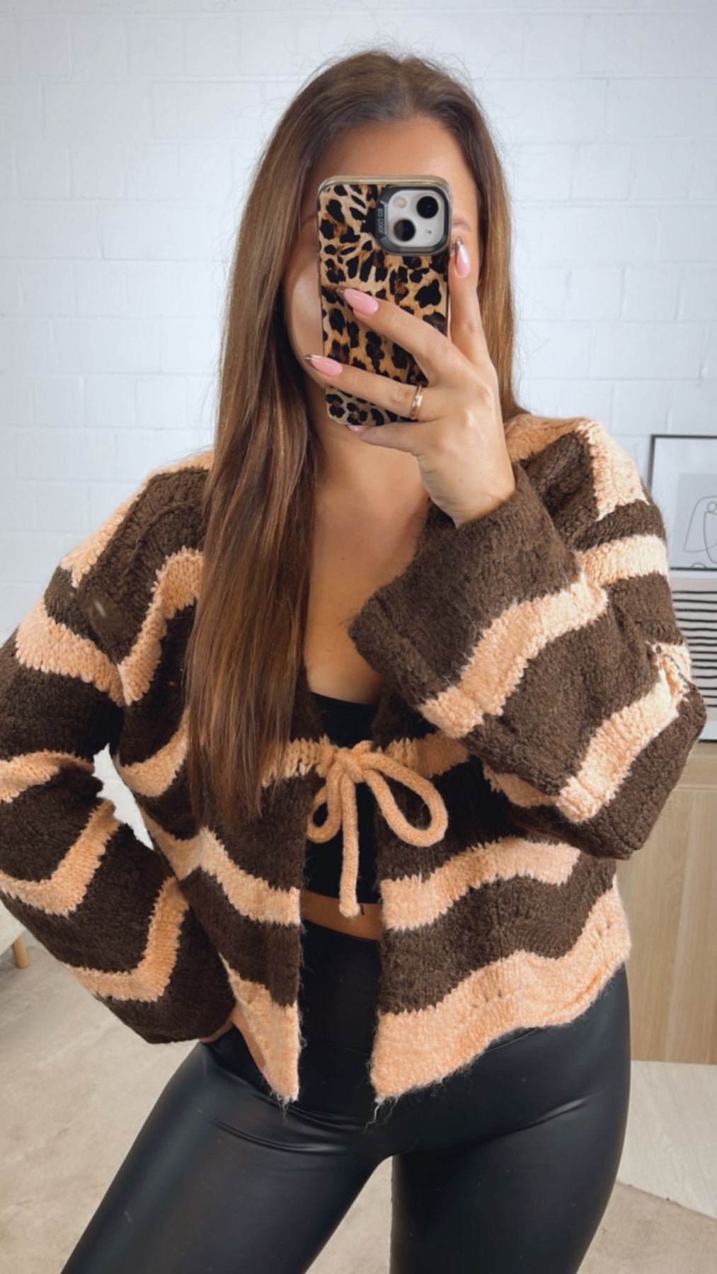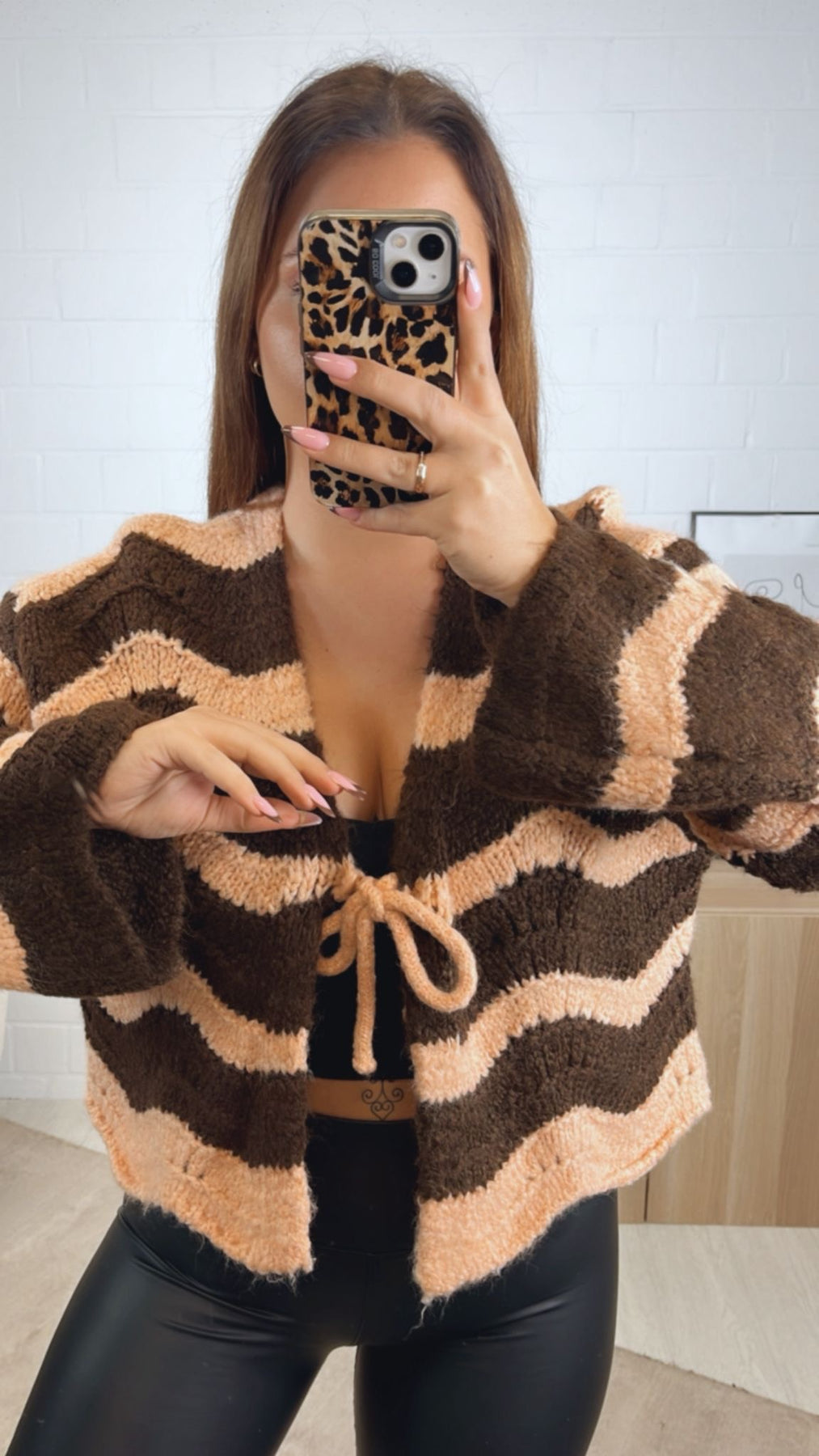 außergewöhnlicher, kurzer Cardigan zum binden, Wellen / dunkel braun - apricot Art. 12849