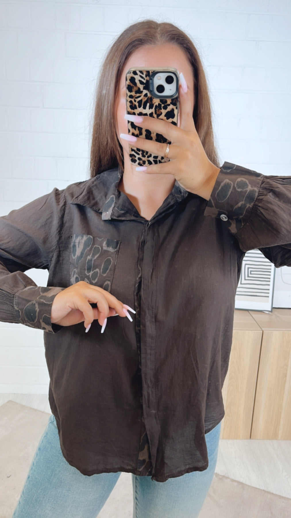 Schlichte, dünn gearbeitete Bluse. Sie hat eine durchgehende Knopfleiste, einen Kragen und eine Brusttasche. Diese ist in einem tollen Leoprint gehalten.