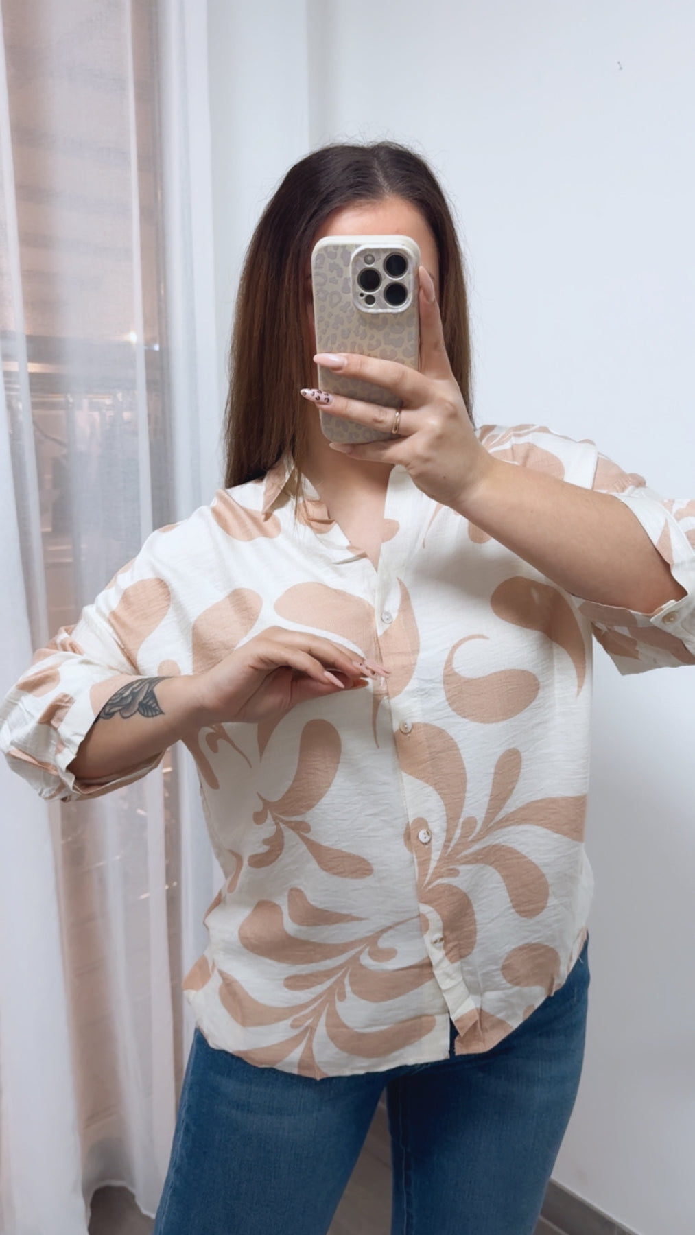 Tolle, leichte Bluse in einem ausgefallenen, stylischen Muster. Sie hat einen Kragen und eine durchgehende Knopfleiste.