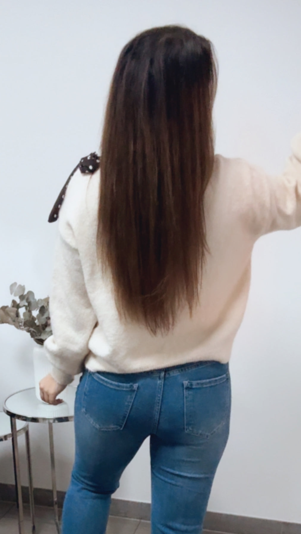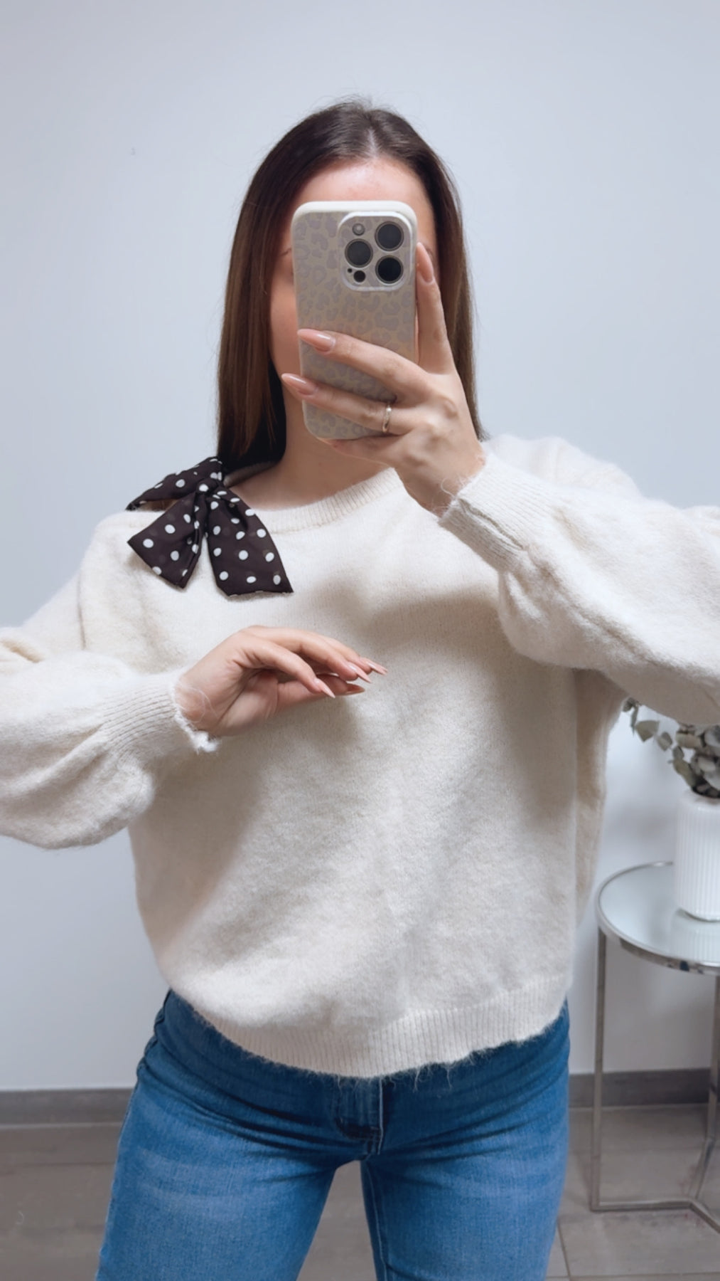 Super süßer Pullover. Das Besondere: er wird oneshoulder getragen, da er auf einer Schulterseite ein cut-out hat. Absoluter Wahnsninn! Das Besondere: an diesem cut-out hat er eine Schleife angebracht, welche in einer tollen und angesagten Punkte-Optik gehalten ist.