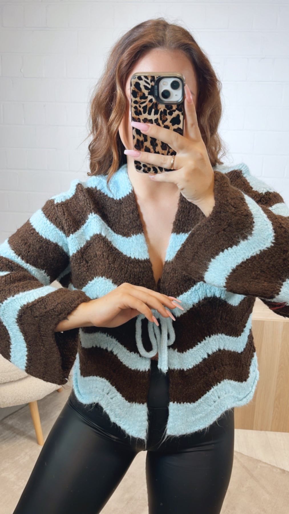 außergewöhnlicher, kurzer Cardigan zum binden, Wellen / dunkel braun - hell blau Art. 12672