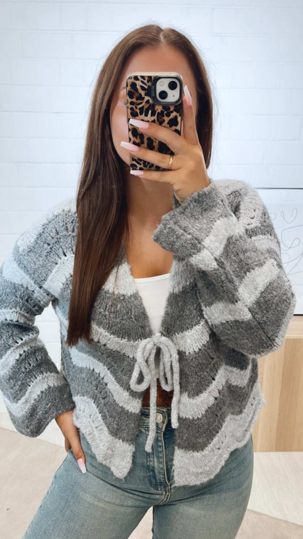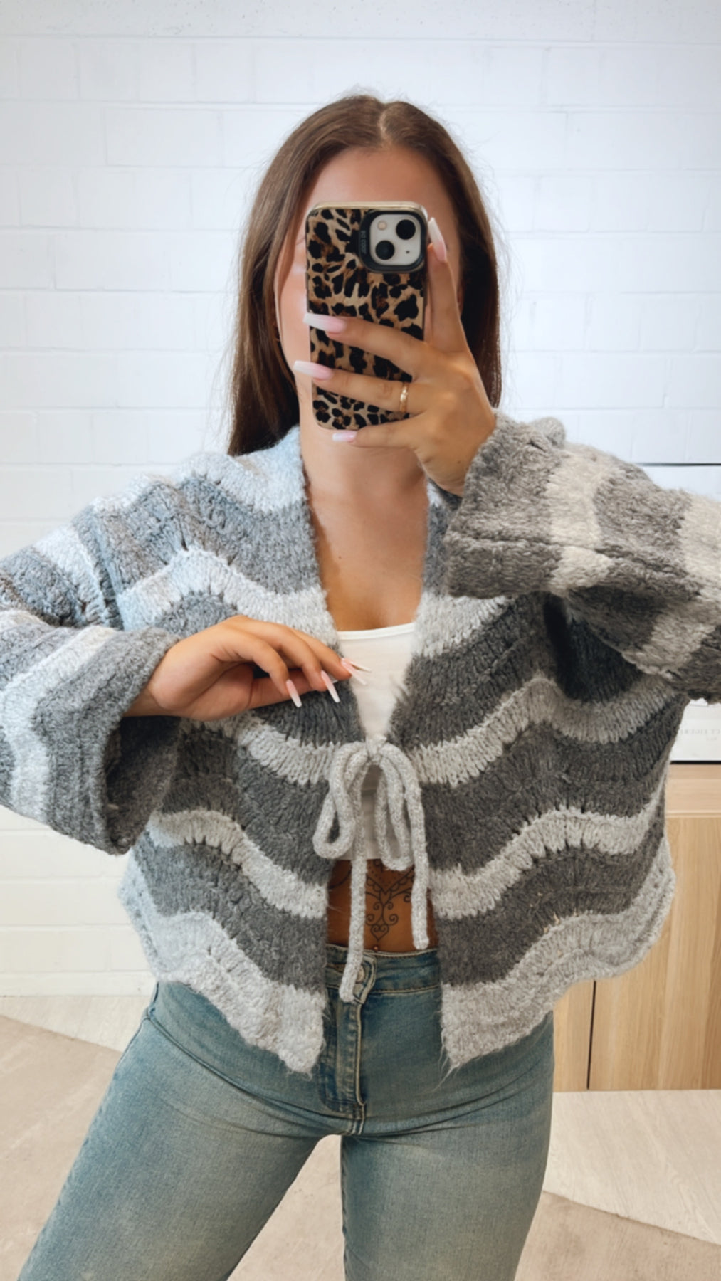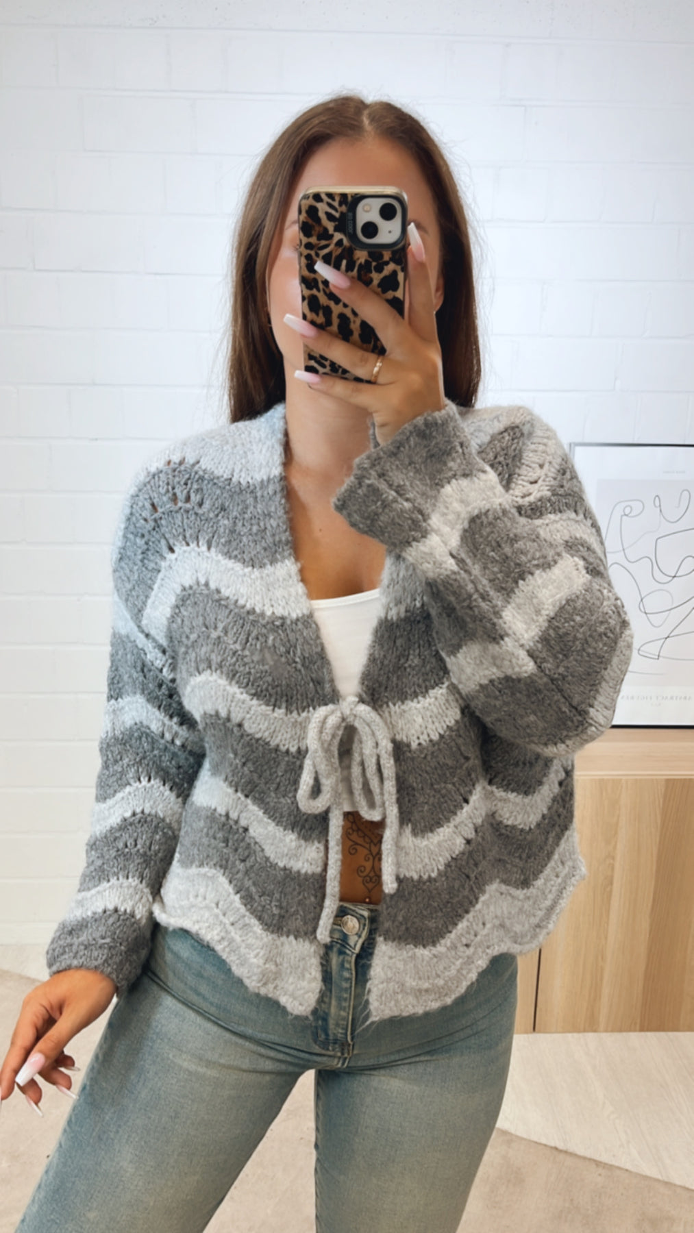 außergewöhnlicher, kurzer Cardigan zum binden, Wellen / grau Art. 11181