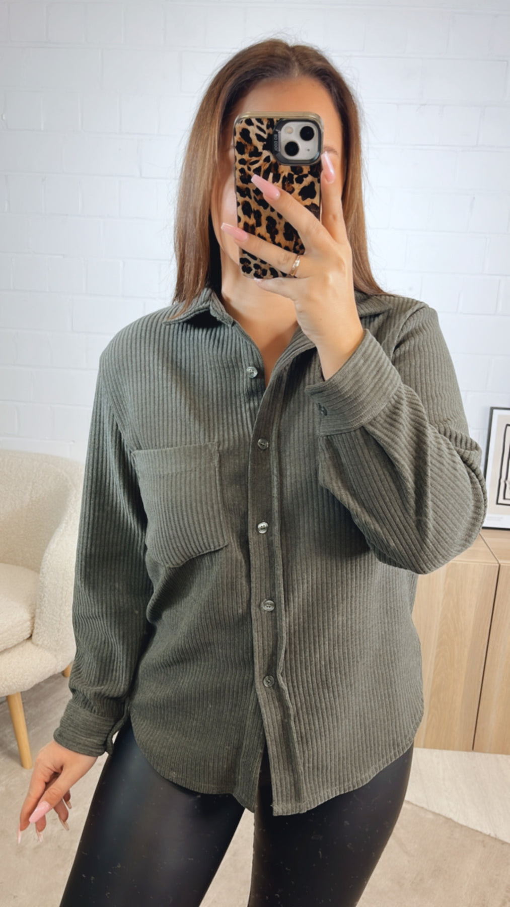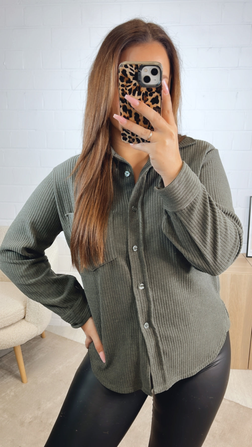 Bluse im Cord Look mit Brusttasche / khaki Art. 12706
