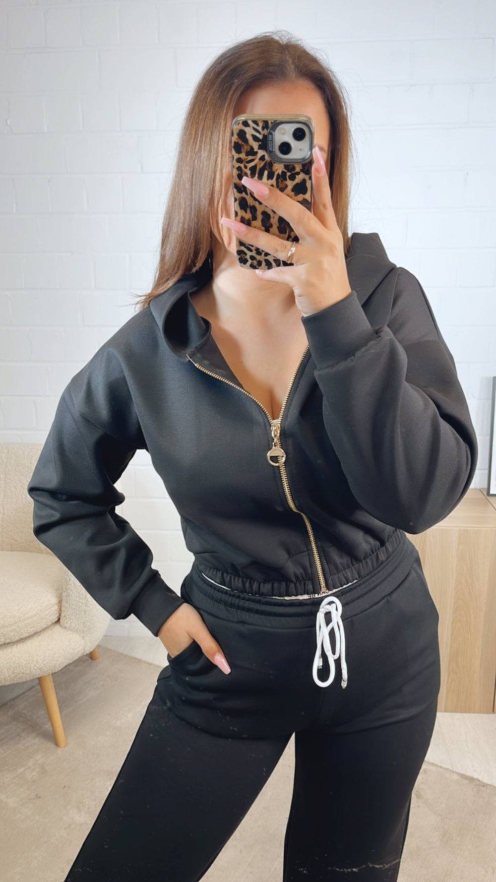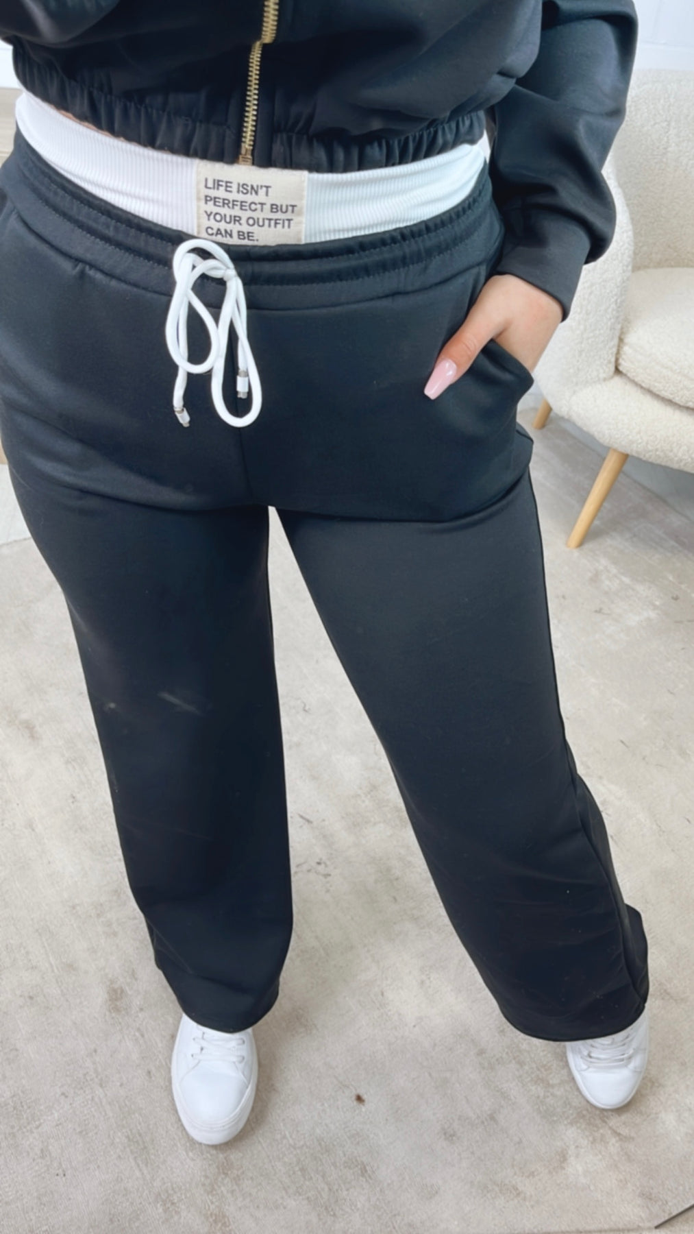 Super stylisches Set, welches aus drei Teilen besteht: einem Bustier Top mit integrierten Cups, einer leichten Jacke mit Reißverschluss und einer super bequemen Hose. Die Hose hat einen elastischen Bund und lässt sich zusätzlich mit einem Tunnelzug inkl. Schnur enger bzw. lockerer schnüren. Außerdem hat sie in mitte des Bund einen Patch eingenäht mit den Worten "Life isn´t perfect but your outfit can be.". Das Bustier Top liegt sehr angenehm auf der Haut auf und hat integrierte Cups. Das Praktische: alle drei Teile können separat und unabhängig voneinander getragen und kombiniert werden.