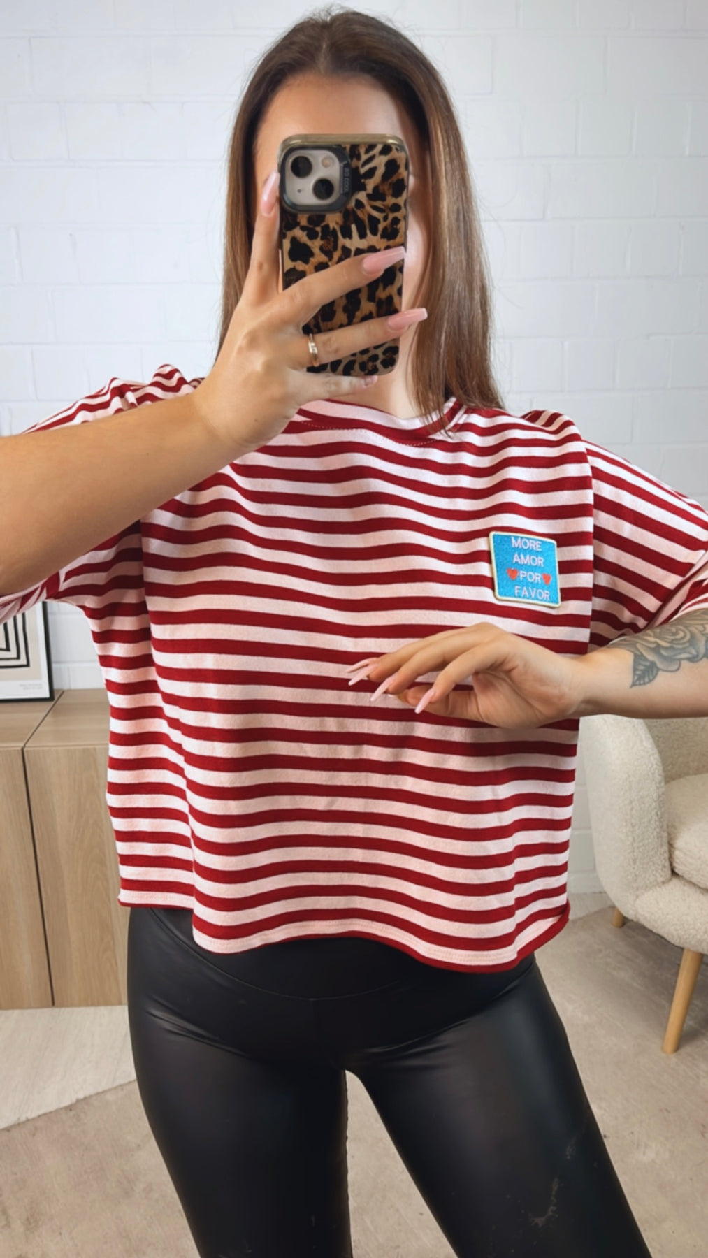 Tolles Oberteil, welches in einem Streifen-Design gehalten ist. Auf der Vorderseite hat es auf Höhe der linken Brust einen Patch mit den Worten "More amor por favor" aufgenäht.