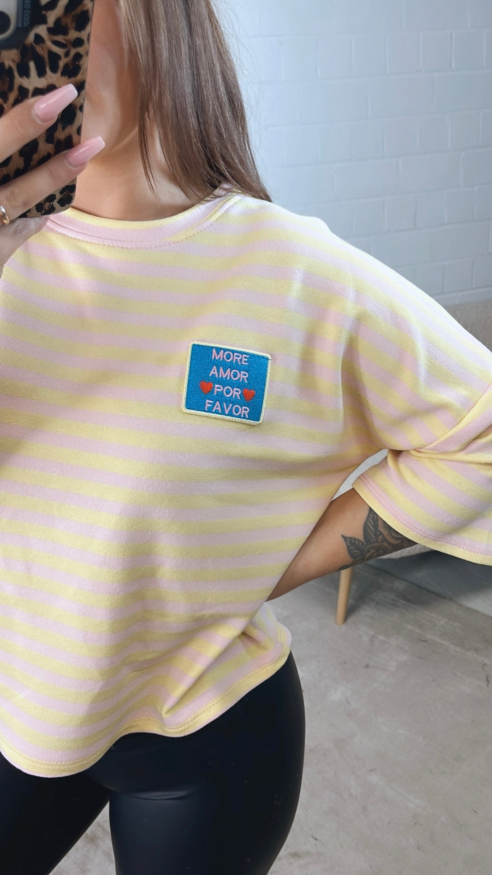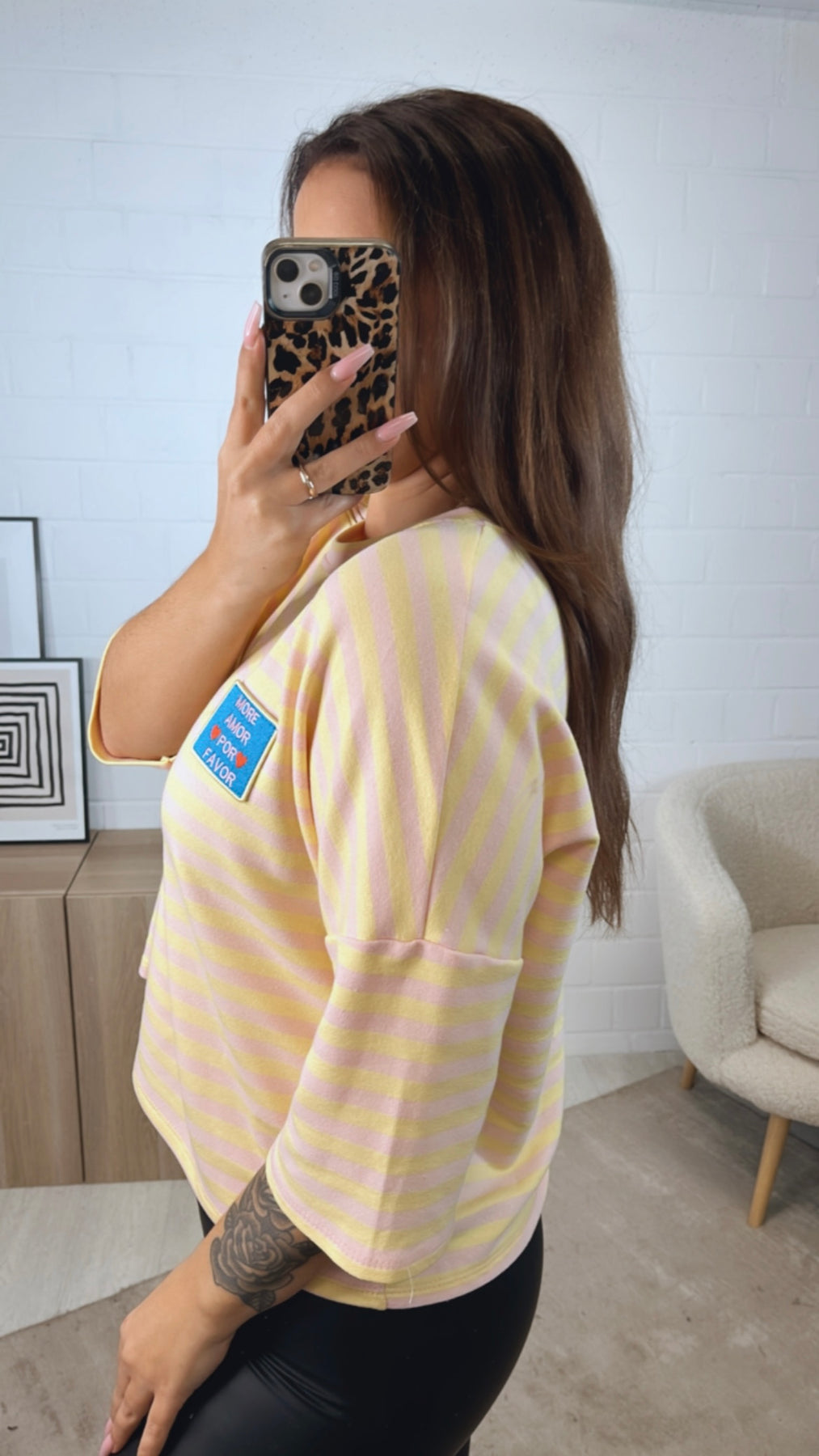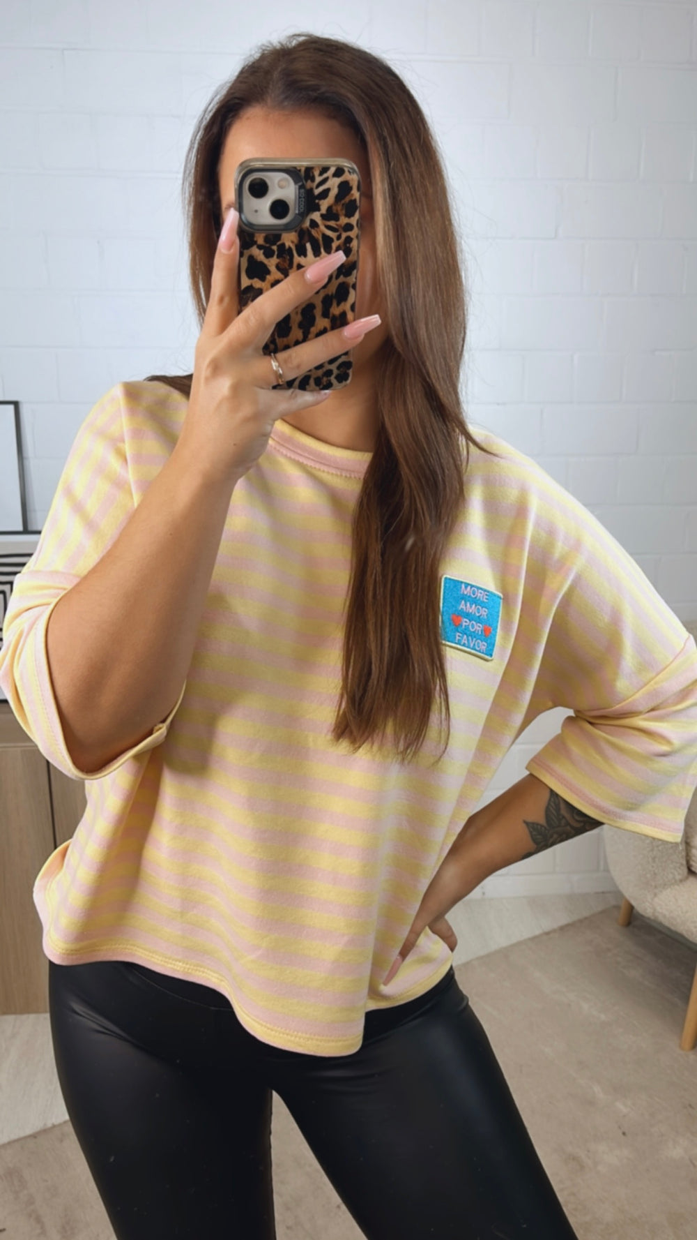 gestreiftes Oberteil " More amor por favor " / soft gelb - soft rosa Art. 12733