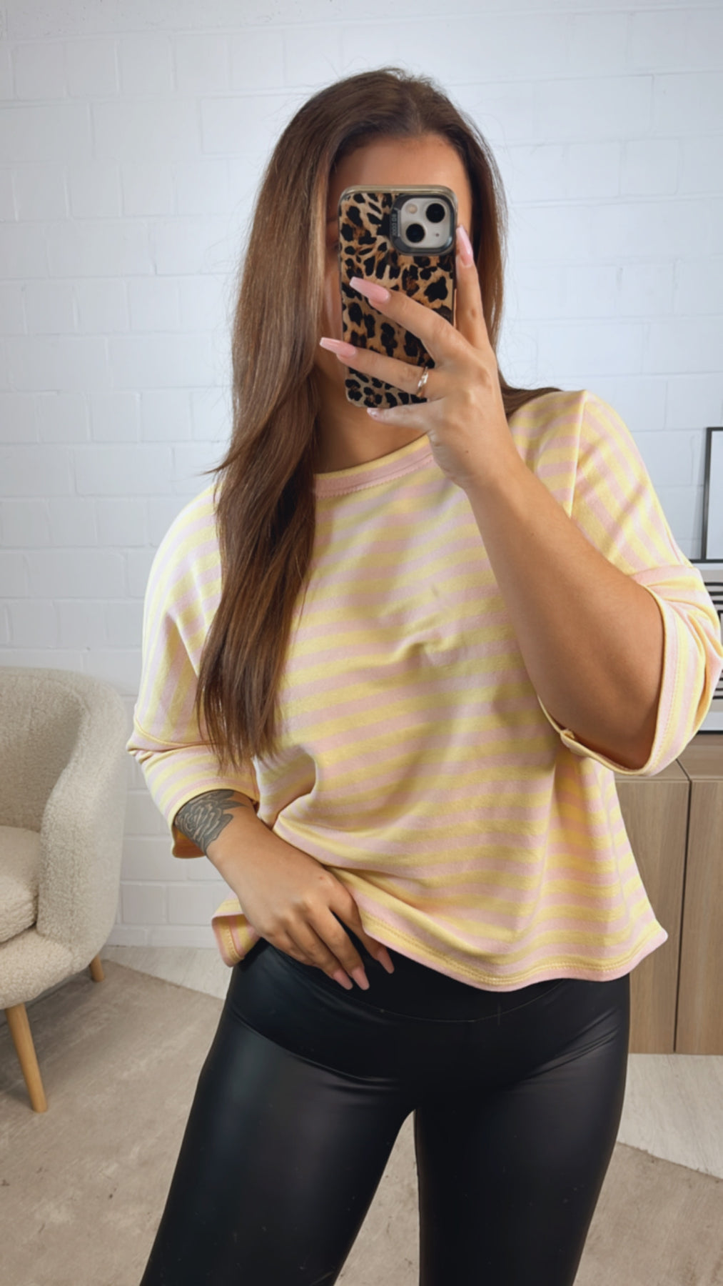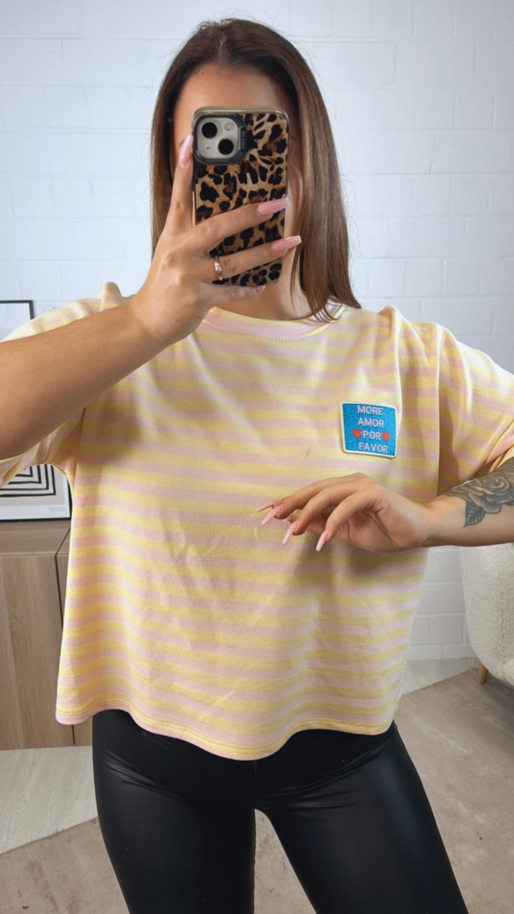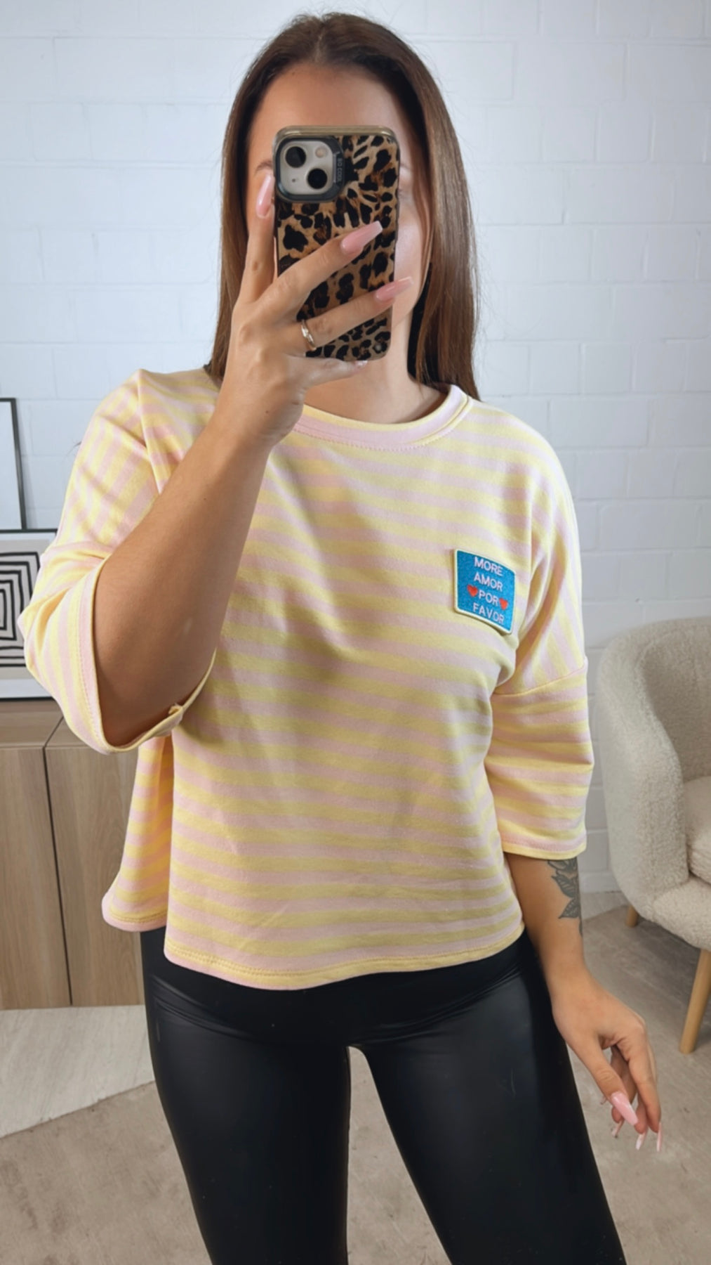 gestreiftes Oberteil " More amor por favor " / soft gelb - soft rosa Art. 12733