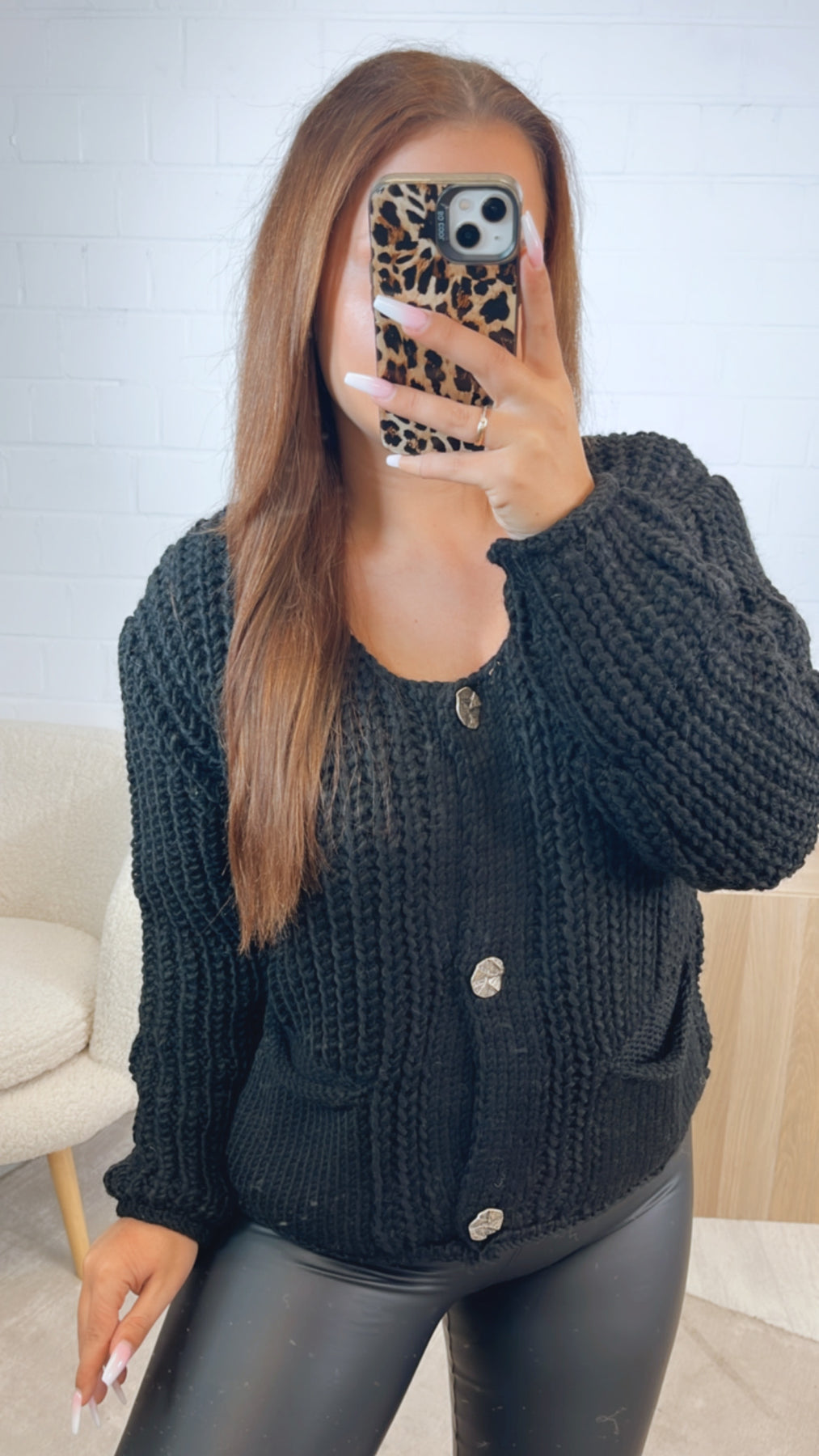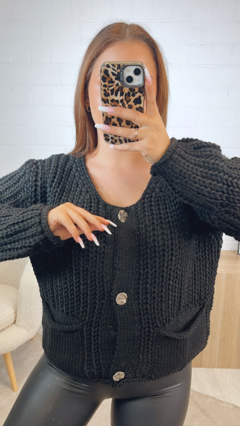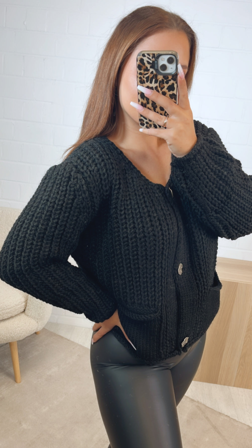 Grob gestrickter, kürzerer Cardigan, welcher sich mit einer Knopfleiste variabel öffnen bzw. schließen lässt. Seine Knöpfe sind größer und ausgefallen gestaltet. Durch diese wird der Cardigan zu einem absoluten Hingucker. Das Praktische: er hat auf der Vorderseite zwei Taschen angebracht.