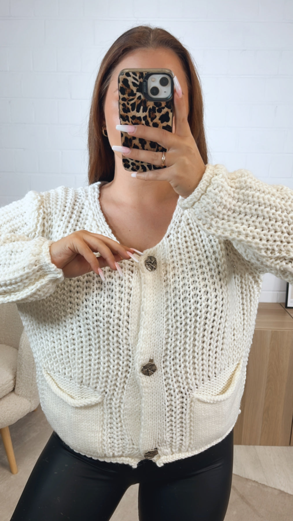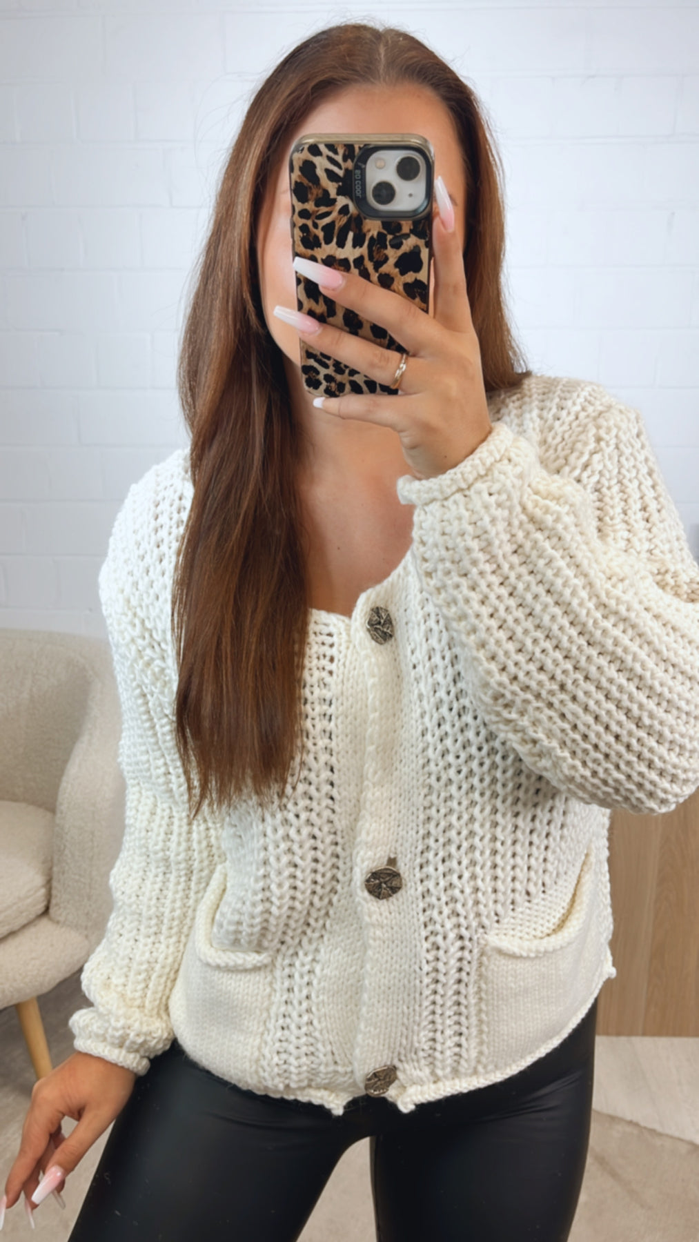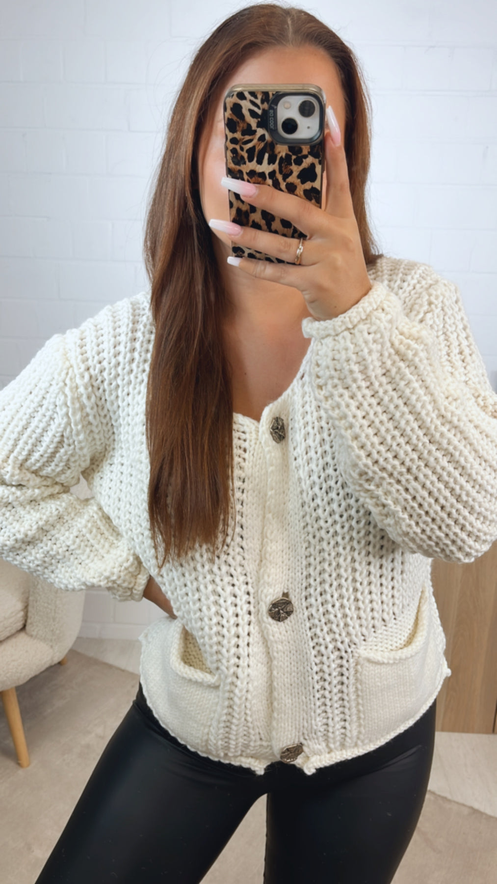 Grob gestrickter, kürzerer Cardigan, welcher sich mit einer Knopfleiste variabel öffnen bzw. schließen lässt. Seine Knöpfe sind größer und ausgefallen gestaltet. Durch diese wird der Cardigan zu einem absoluten Hingucker. Das Praktische: er hat auf der Vorderseite zwei Taschen angebracht.