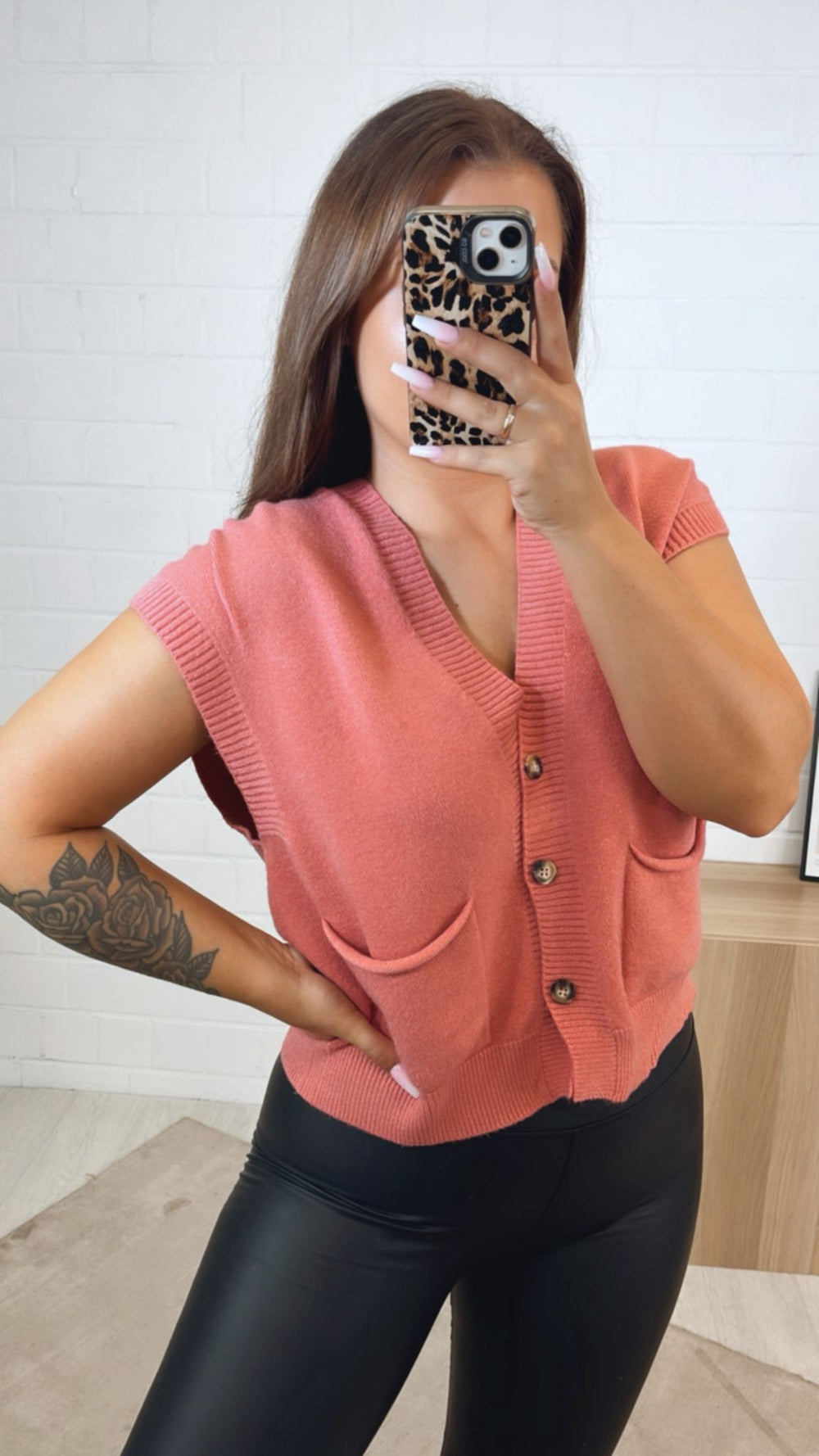 Kürzer geschnittene Strickweste mit drei Knöpfen und Taschen auf der Vorderseite. Total flexibel zu kombinieren mit einem kurz- oder langarm Shirt oder einer Bluse.