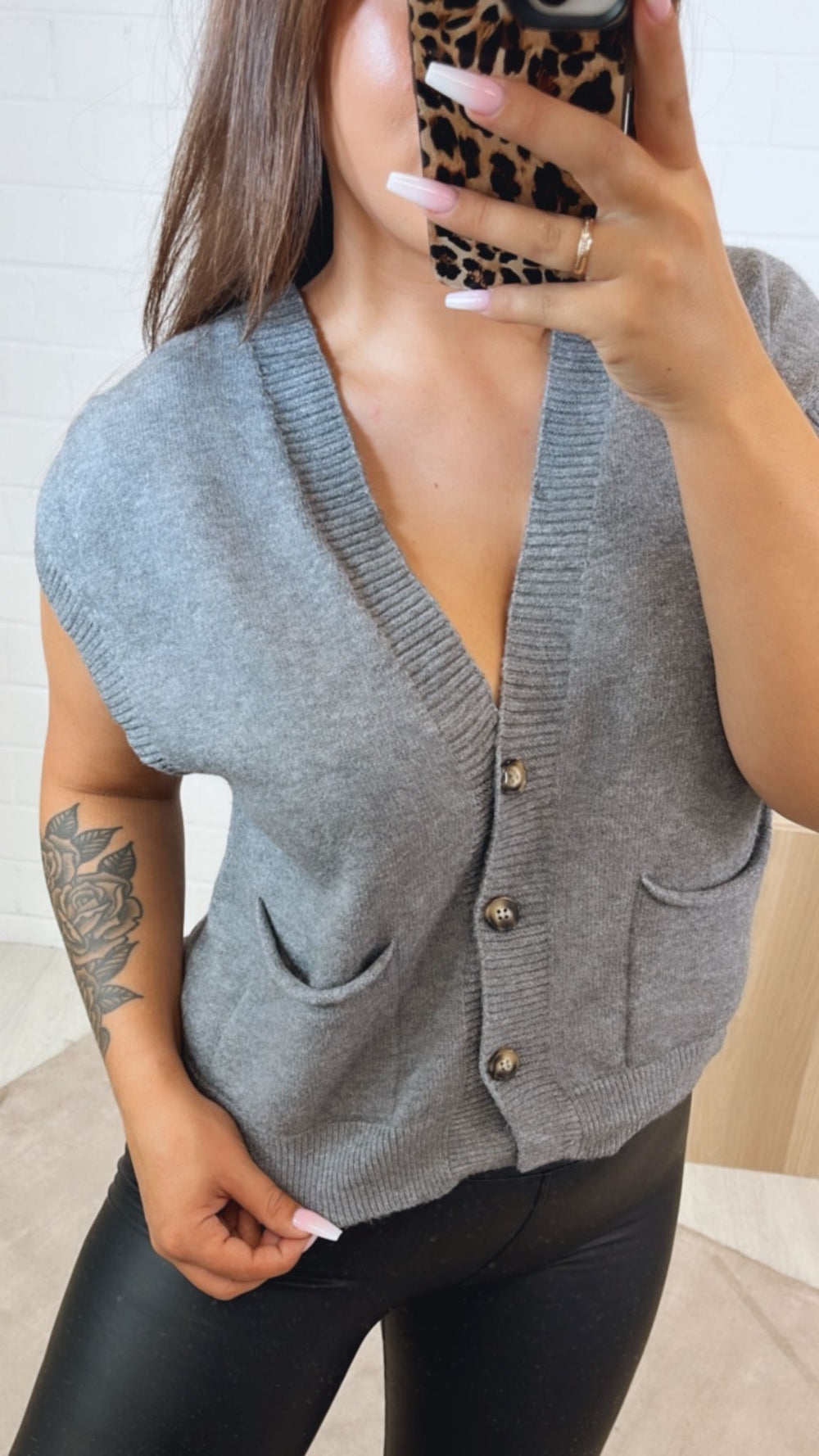 kurze Strickweste mit drei Knöpfen und Taschen / grau Art. 122345