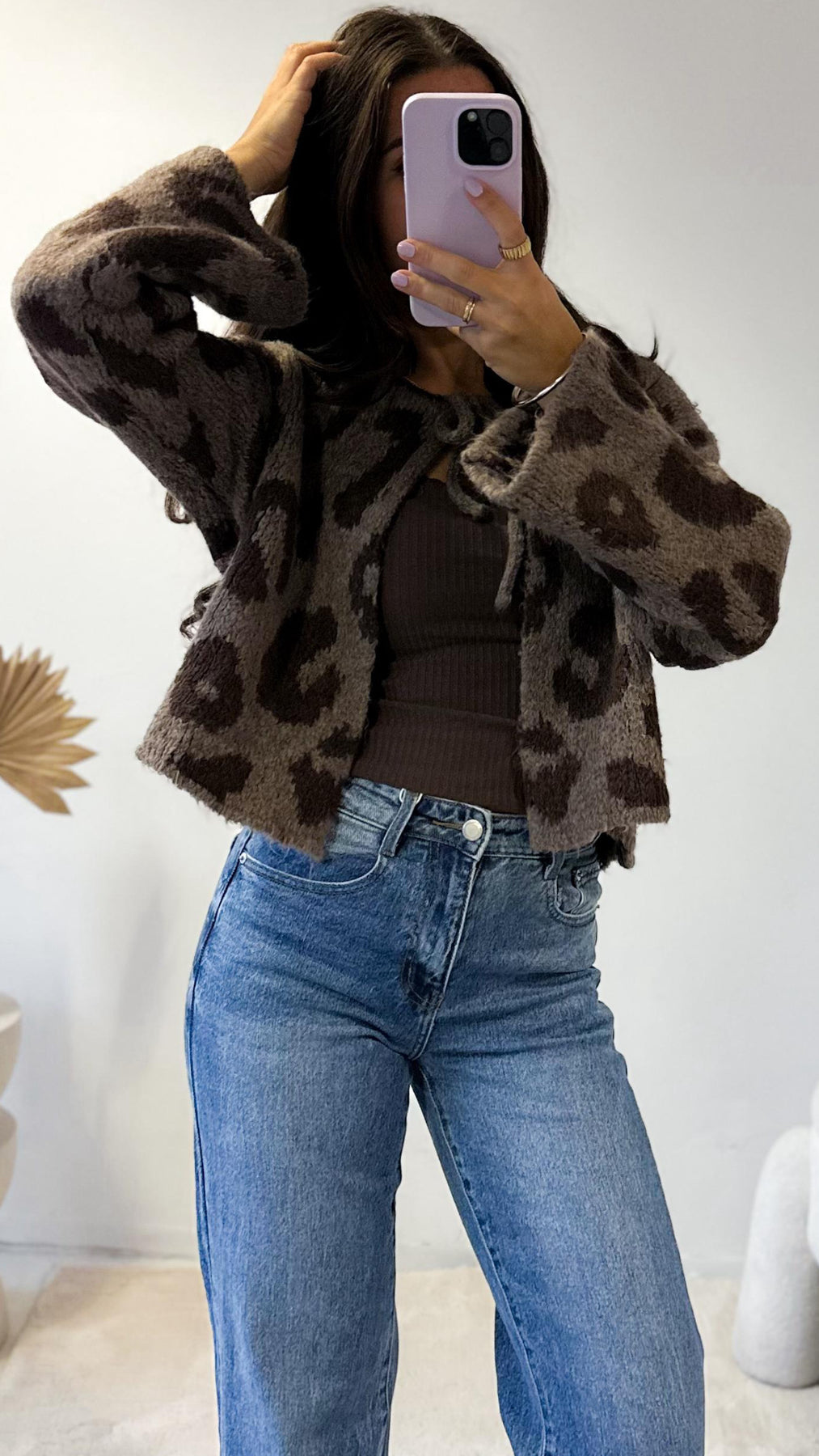 Super süßer Cardigan, welcher sich auf der Vorderseite mit einem Schleifen variabel zubinden bzw. öffnen lässt. Das Tolle: er hat lange, weitere Ärmel und ist im angesagten Leomuster gehalten.