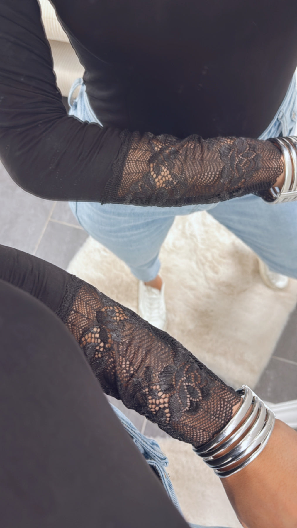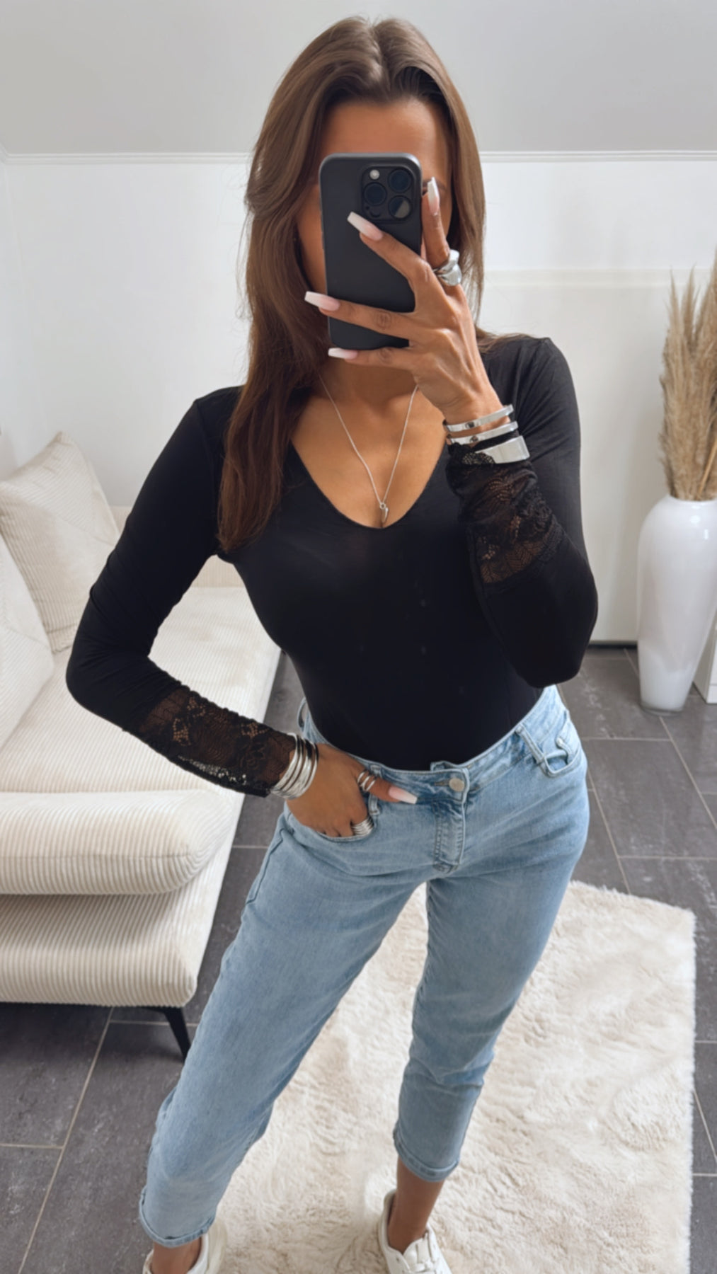 Langarm Oberteil mit Spitzenapplikationen / schwarz Art. 5402
