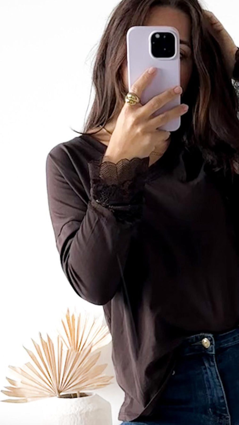 Oberteil mit spitzenbesetzten Ärmeln, V-Ausschnitt / schoko braun Art. 12903