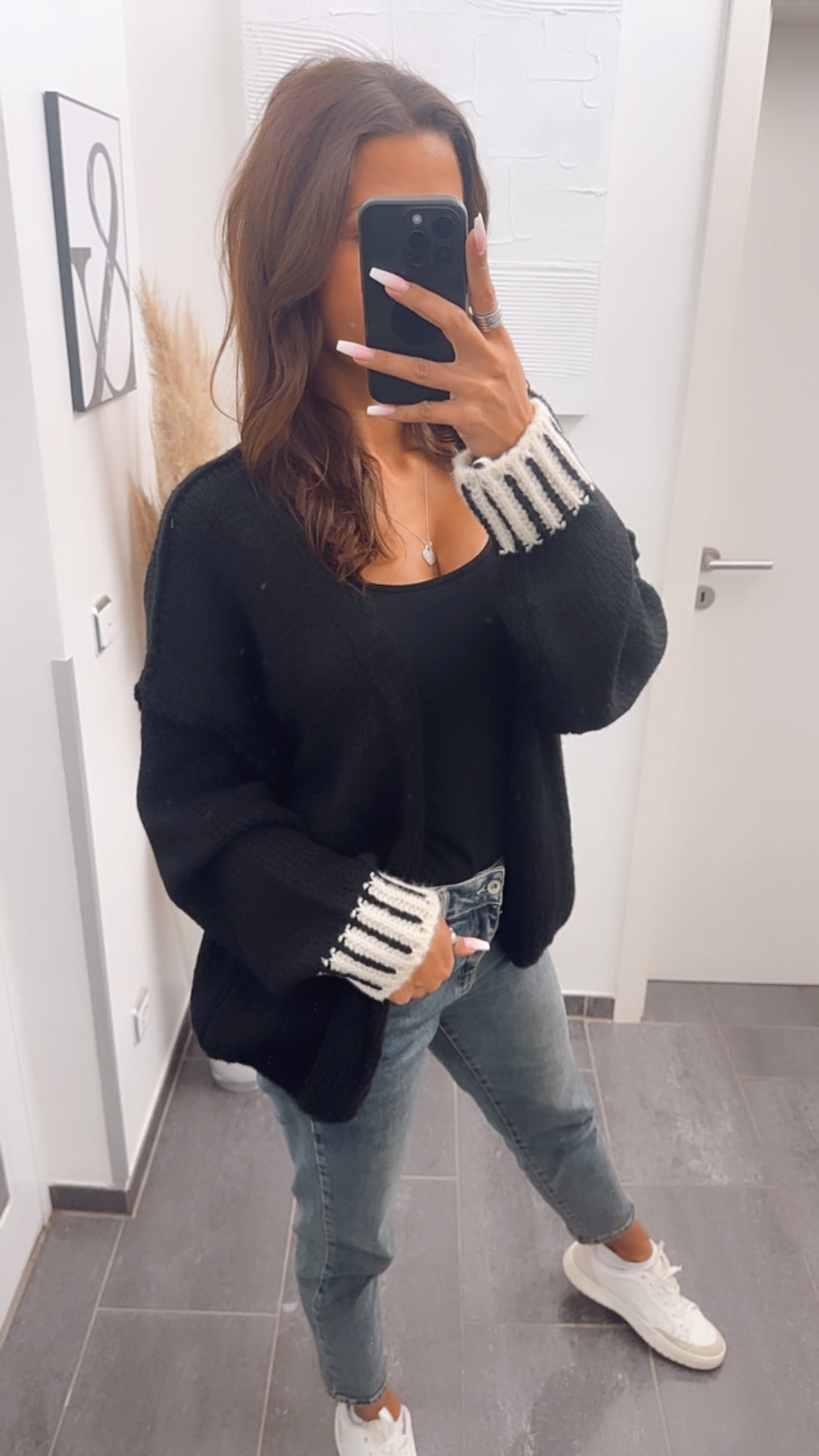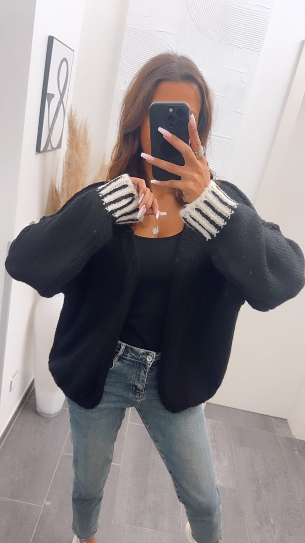 Toller, offener Strickcardigan. Durch seine weißen Akzente am Handgelenk wird er zu einem absoluten Hingucker.