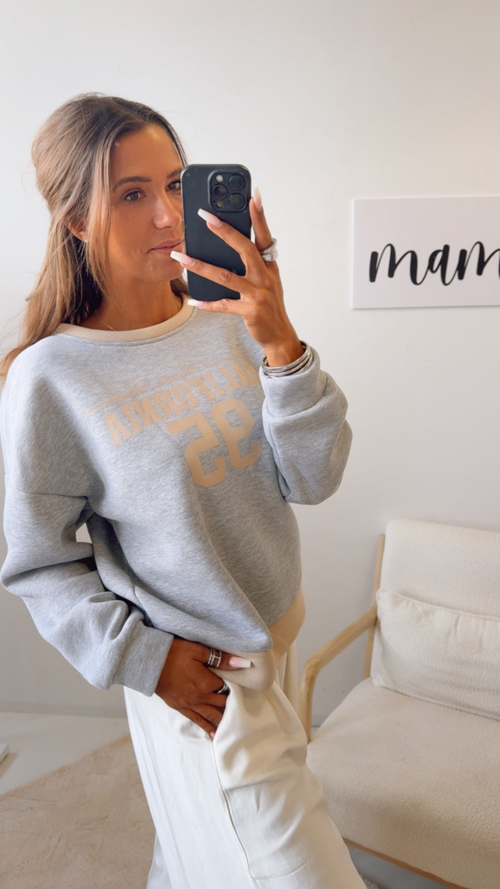 Cooler, lässiger Pullover in einem leichten oversize-Schnitt. Er hat einen etwas höherliegenden Rundausschnitt und lange, weite Ärmel. Auf der Vorderseite hat er einen Aufdruck in beige-farbener Schrift.