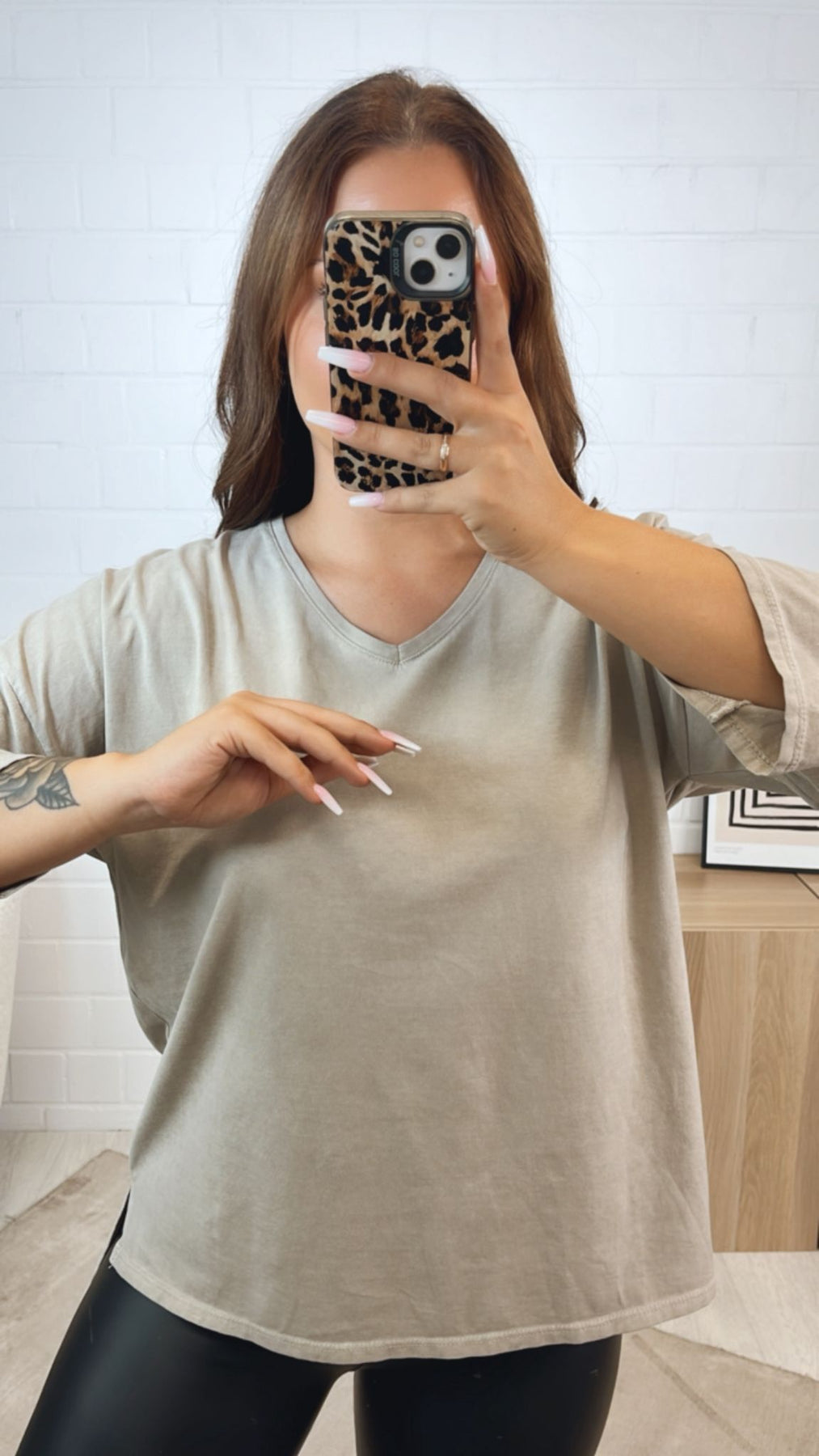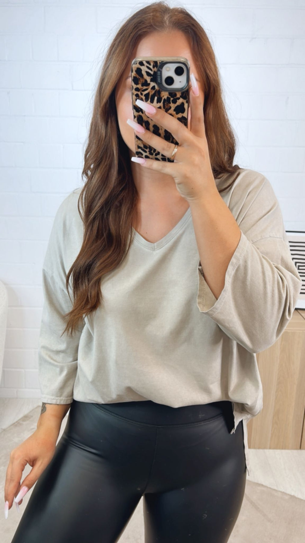 schlichtes Vokuhila Oberteil mit V-Ausschnitt, Schlitz / beige - grau Art. 12340