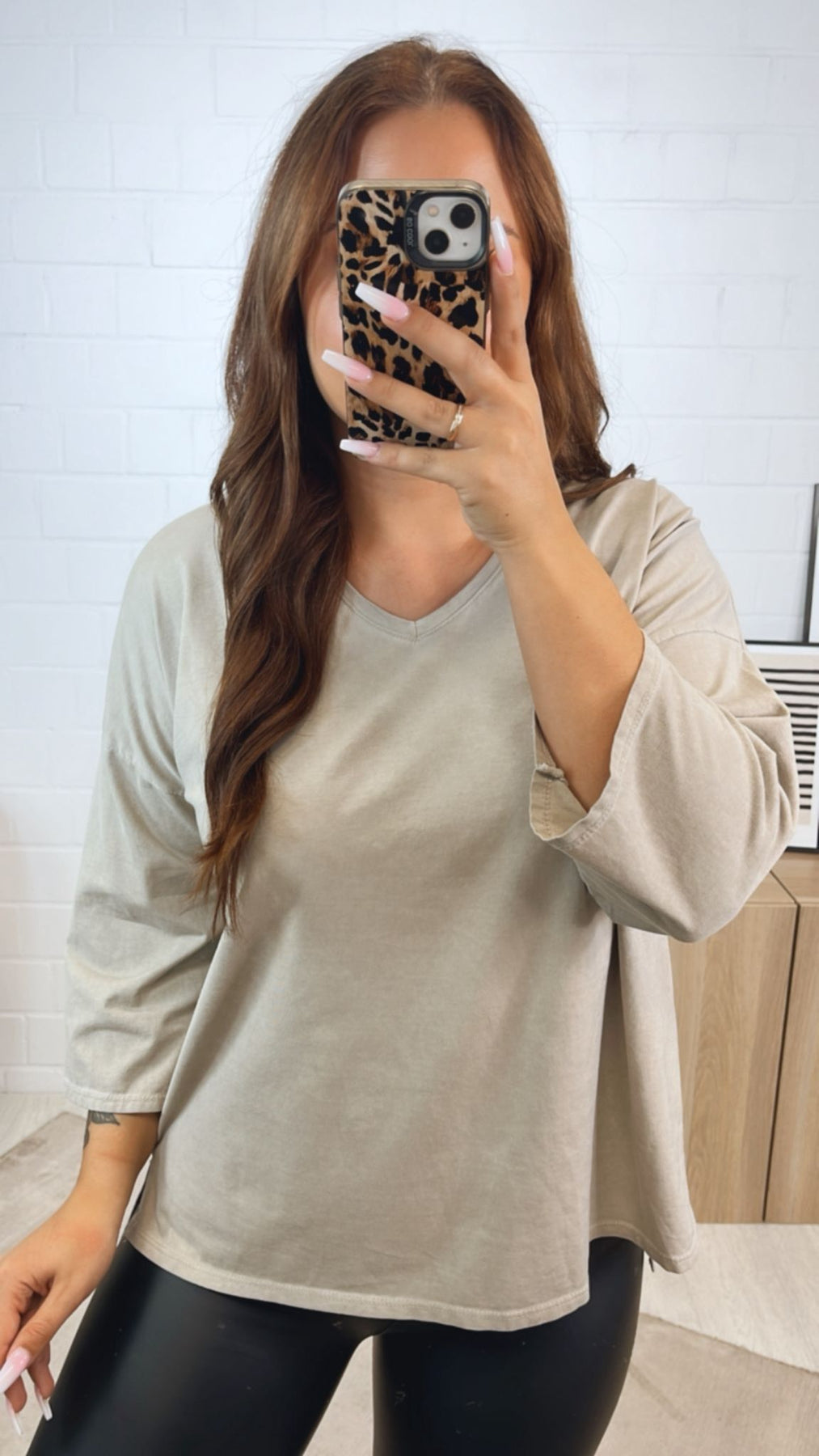 Schlichtes, leichtes Oberteil mit V-Ausschnitt. Seine Ärmel sind in einer 3/4-Länge gehalten. Vorne fällt es etwas kürzer als hinten und an jeder Seite hat es einen kurzen Schlitz eingearbeitet.