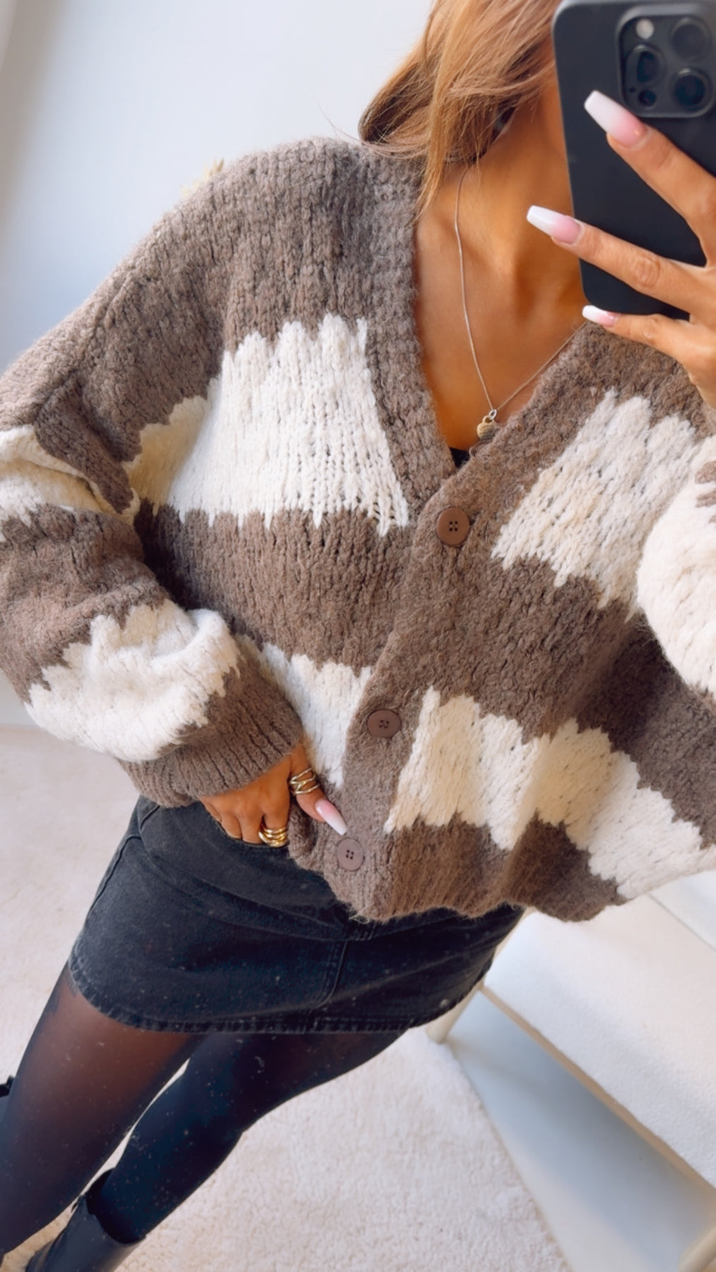 Süßer StrickCardigan, welcher mit einer Knopfleiste geöffnet und geschlossen werden kann. Er ist in einem zwei-Farben-Mix gehalten und lädt zum Einkuscheln ein.