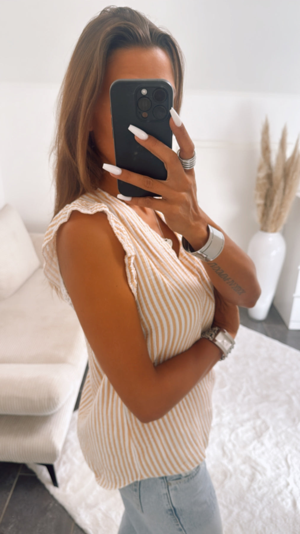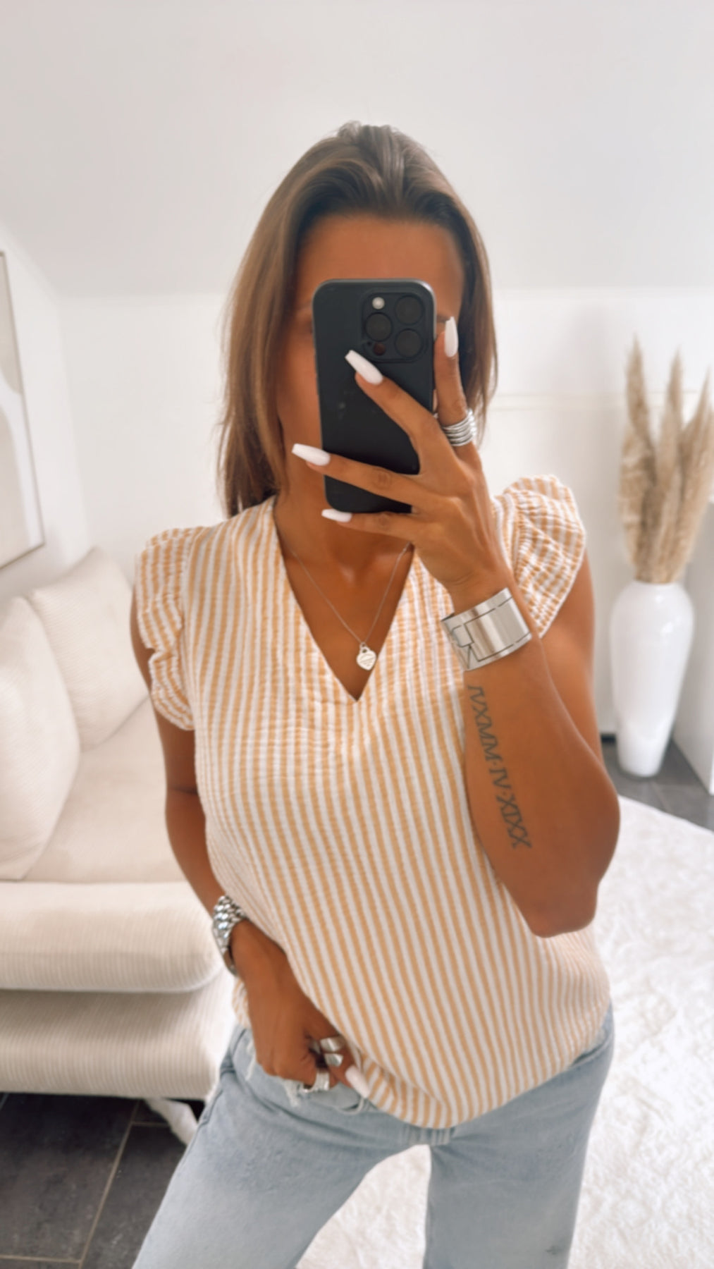 STREIFEN Musselin Oberteil mit Volant Schultern / weiss - apricot Art. 10494