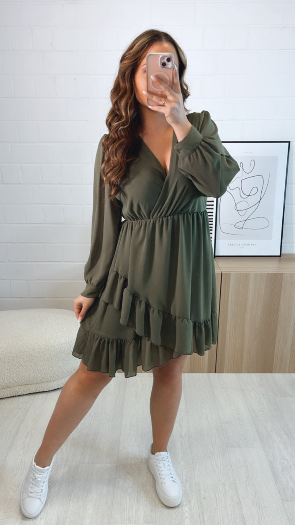 Chiffon Kleid in Wickeloptik / khaki Art. 9606