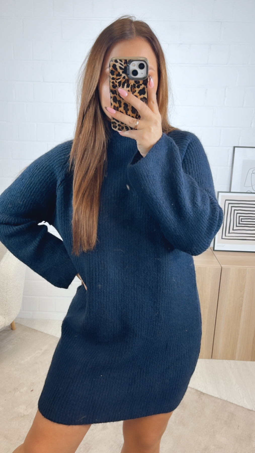gradliniges Strick Kleid / Long Pullover mit weitem Arm, Stehkragen / dunkles marine blau Art. 12819