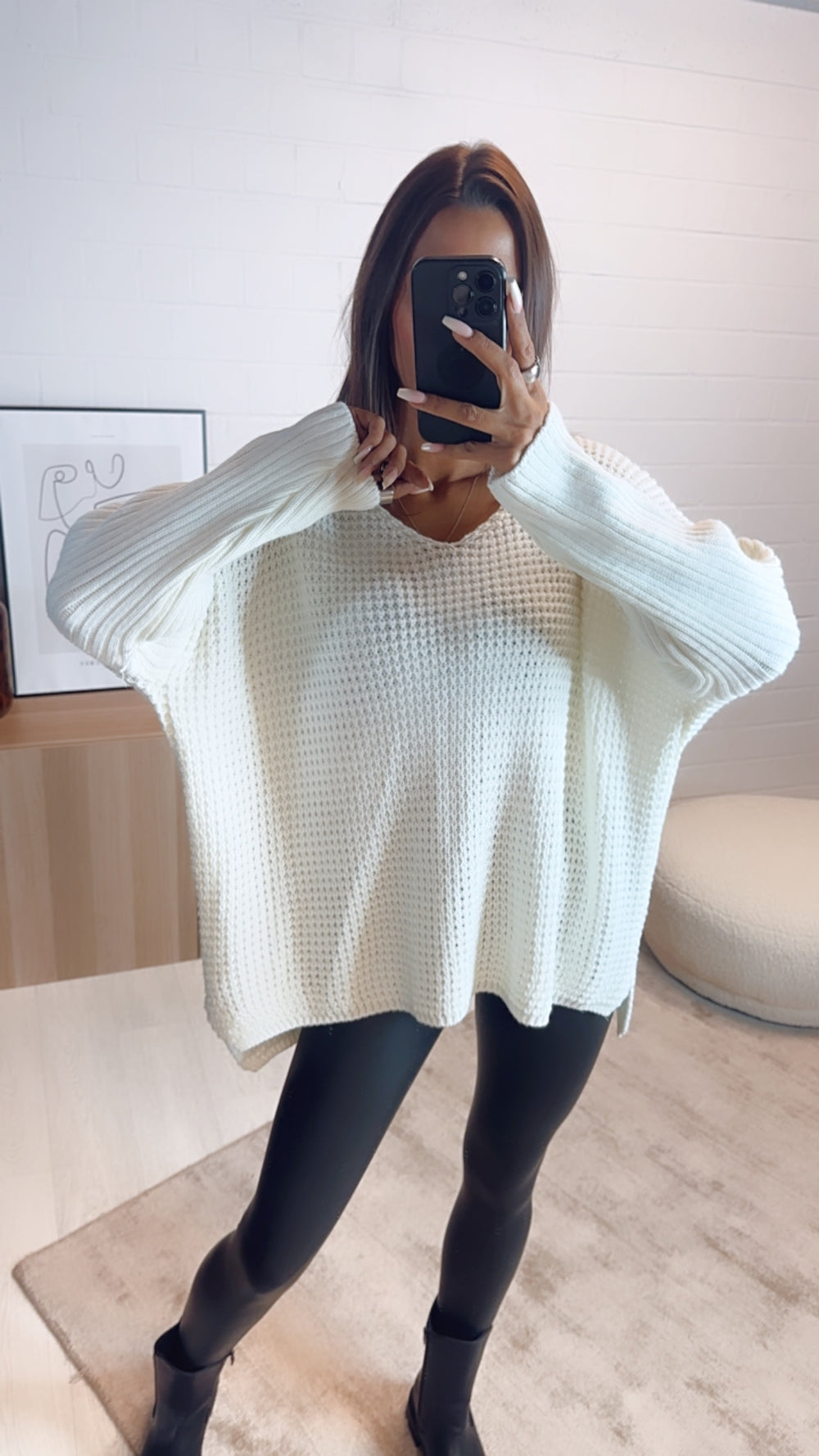 grober Strick Pullover, engere Ärmel, V-Ausschnitt / wollweiss Art. 7581