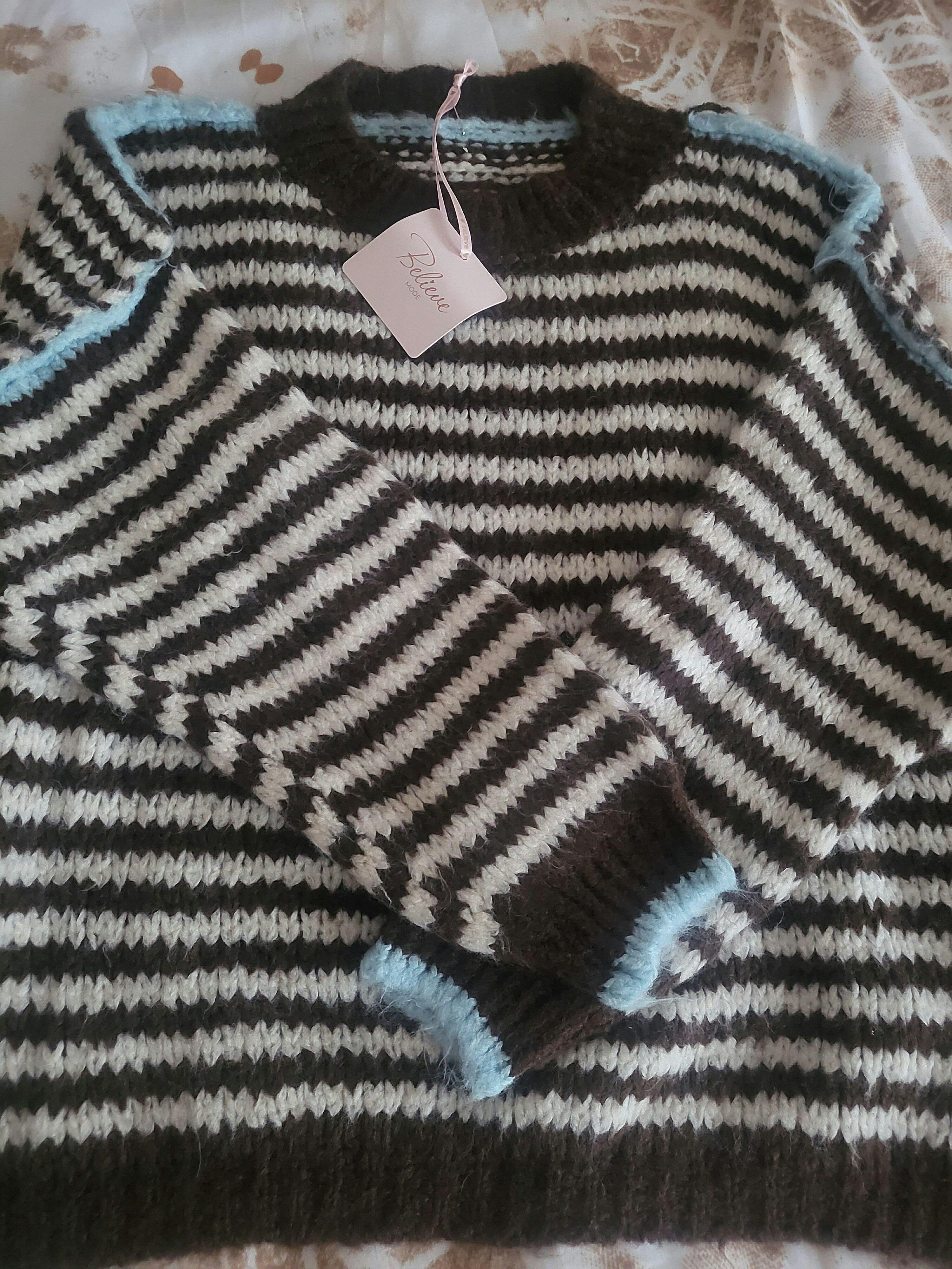 Schöner, kuscheliger Pullover, welcher in einem gestreiften Muster gearbeitet ist. Seine Schulternaht und Zuernath am Ärmel ist farblich abgesetzt.