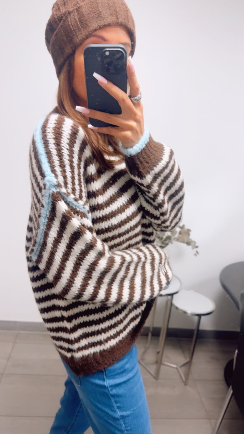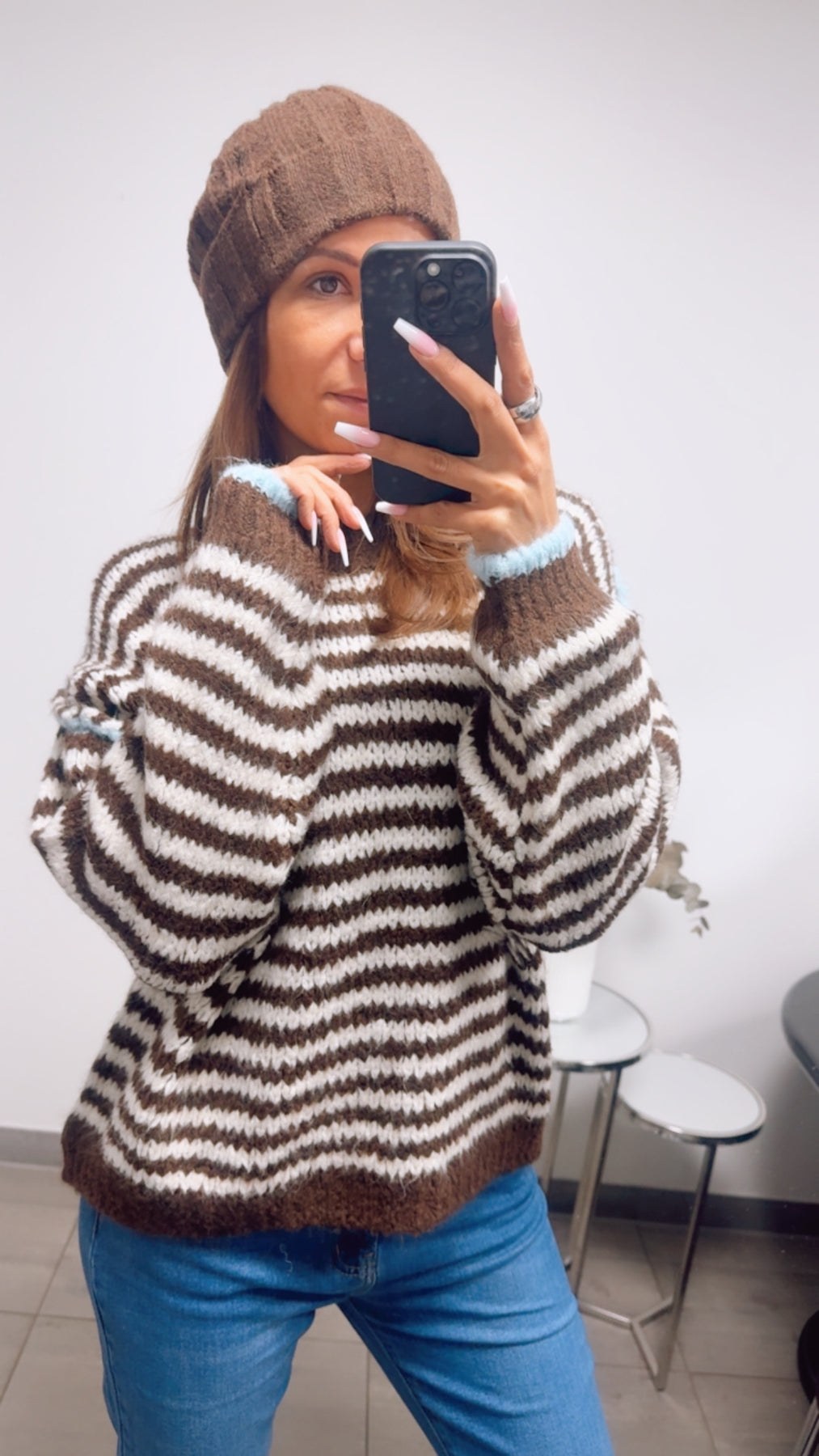 kurzer Kuschel Pullover, gestreift / schoko braun - weiß - hell blau Art. 13624