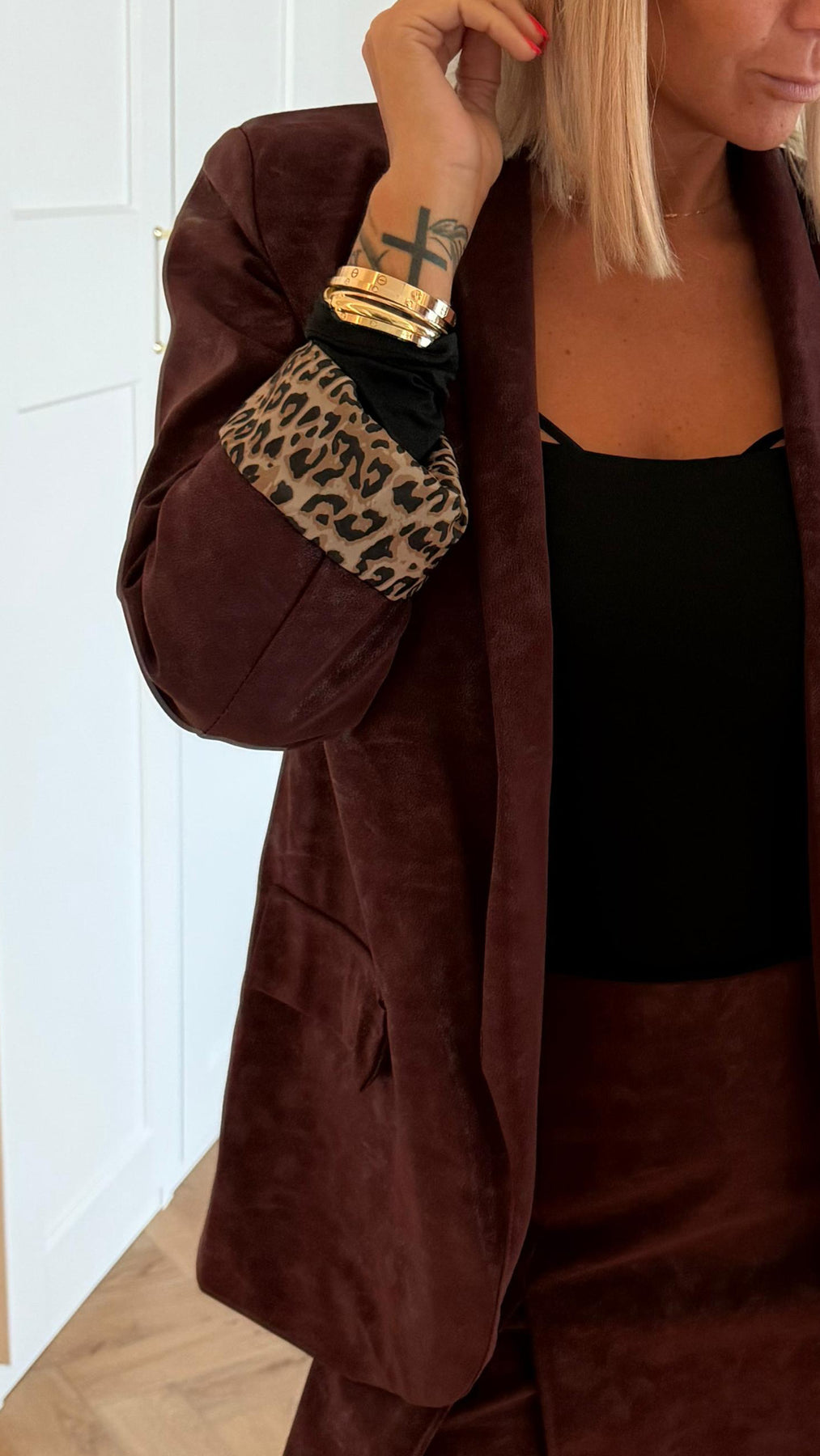 Super stylischer Blazer, welcher offen geschnitten ist. Die zwei Taschen auf der Vorderseite sind angedeutet und dienen rein zur Zierde. Durch seine schimmernde Lederoptik wird er zu einem absoluten Hingucker. Das Praktische: wer auf Leomuster steht hat die Möglichkeit seine Ärmel hochzukrempeln und ein tolles, stylisches Leomuster hervorzuholen.