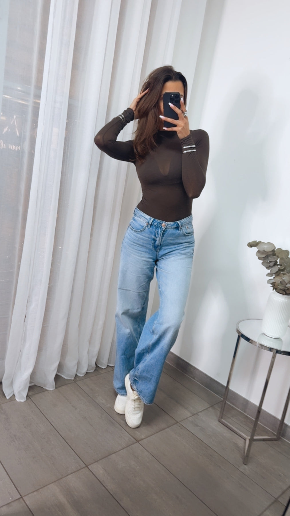 Super stylisches, dünnes und transparentes Oberteil mit langen Ärmeln und einem leichten Stehkragen.
