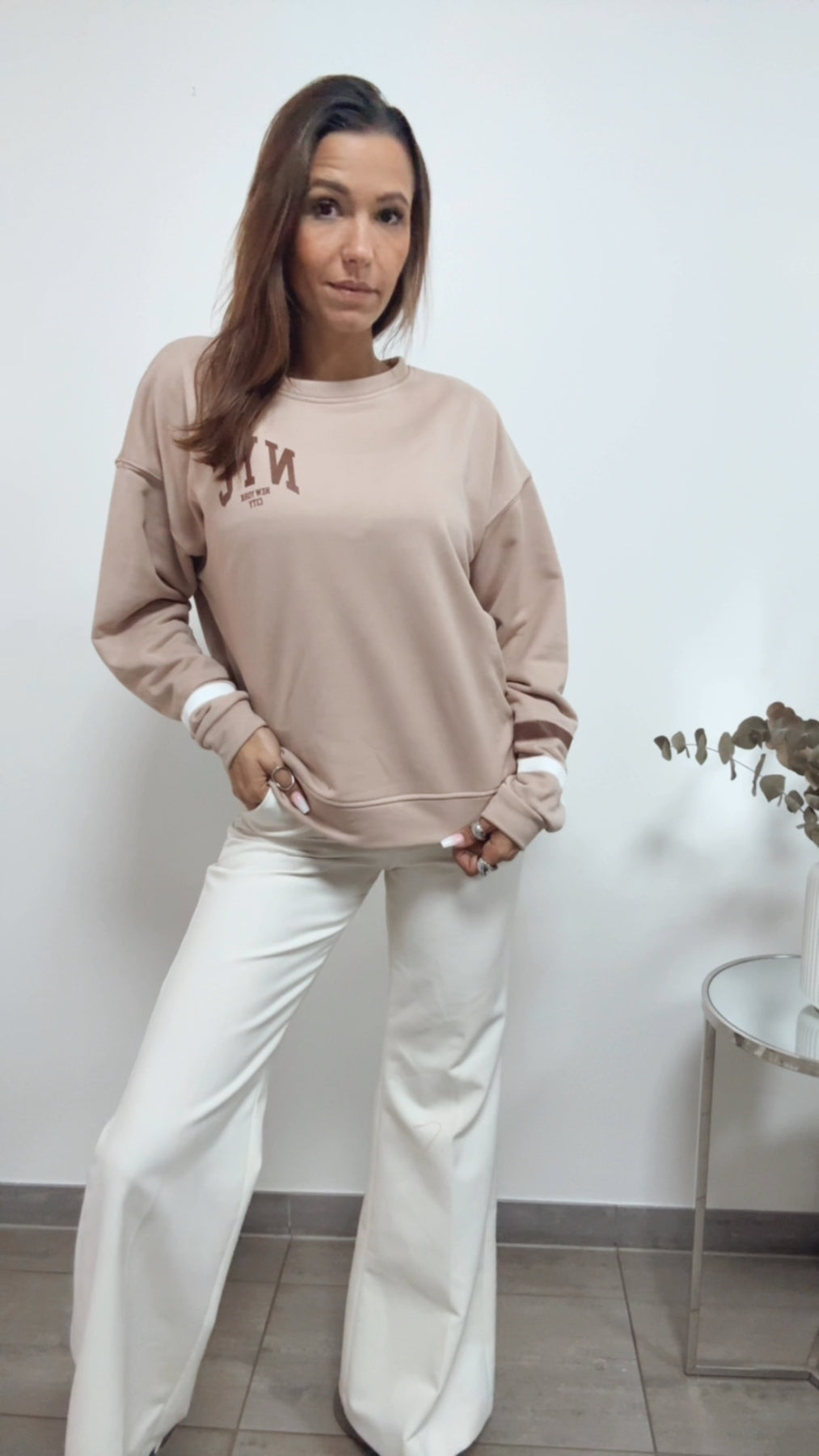 Etwas länger geschnittener Oversize-Pullover. Auf der Vordersiete hat er klein "NYC New York City" aufgedruckt. Dieses Logo wiederholt sich auf der Rückseite, nur größer.